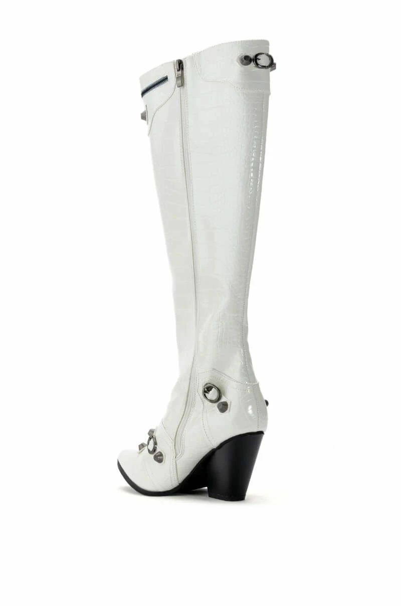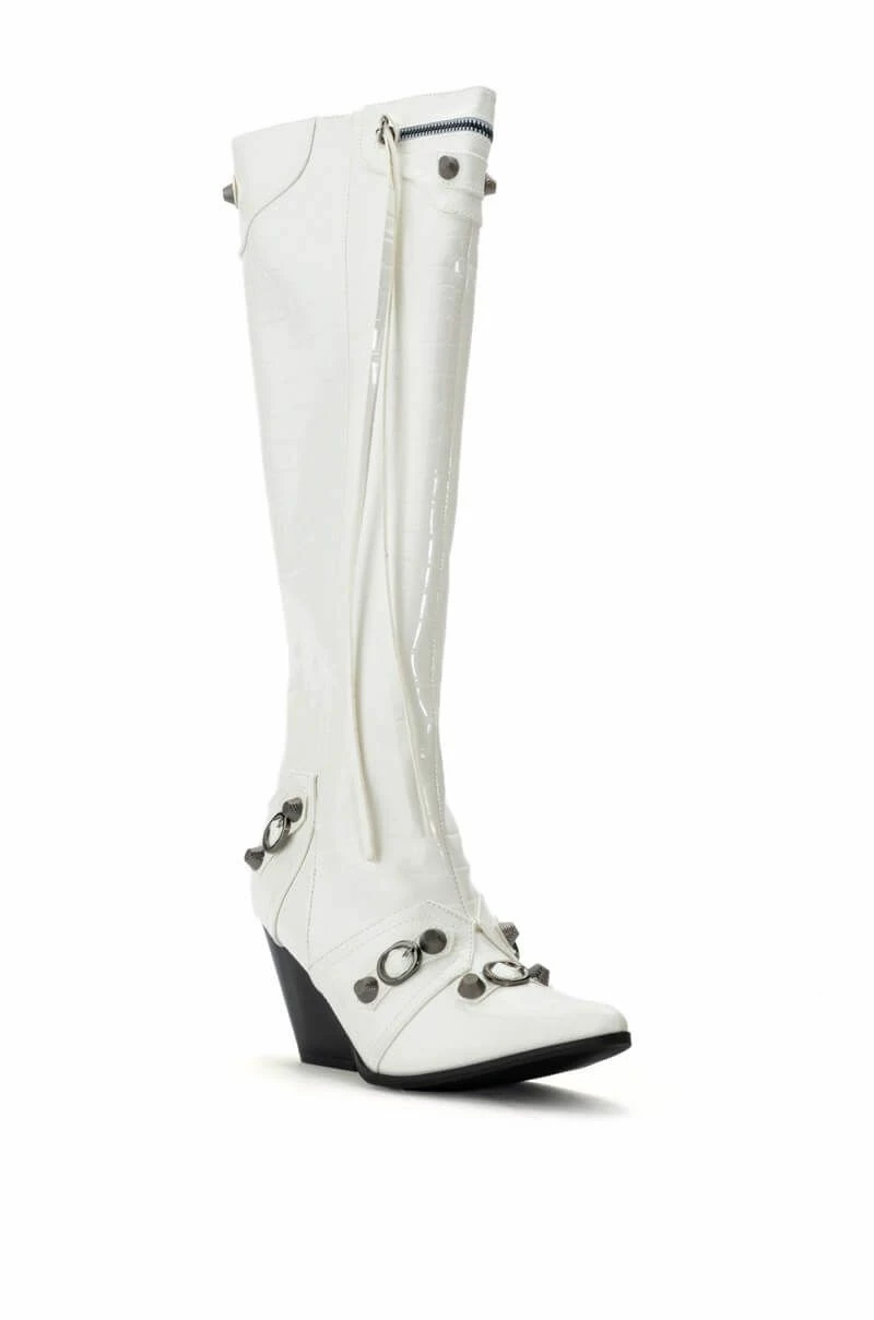 The Good One White Croc Boot is a faux leather croc-embossed boot featuring a pointed toe silhouette, a chunky heel, and a knee-height shaft. Complete with faux buckle accents throughout, silver metallic hardware, top zip detailing, tassel trim, and a tonal inner ankle zipper closure. Style with a sleek mini skirt, an oversized band tee, and a faux leather jacket for a complete look.