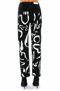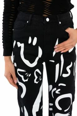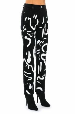 The AKIRA Label Abstract Painted High Waisted Wide Leg Jean features sturdy denim fabrication, graphic painted abstract print patterning, a high rise waist, working belt loops, a classic five-pocket design, a straight leg silhouette, and a front button and zipper closure.