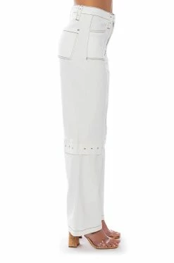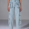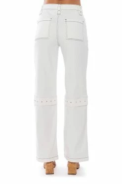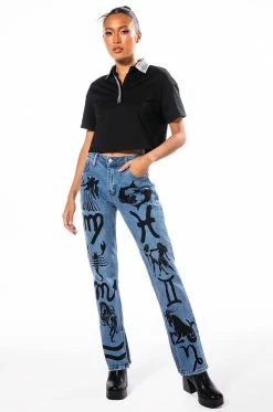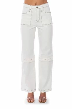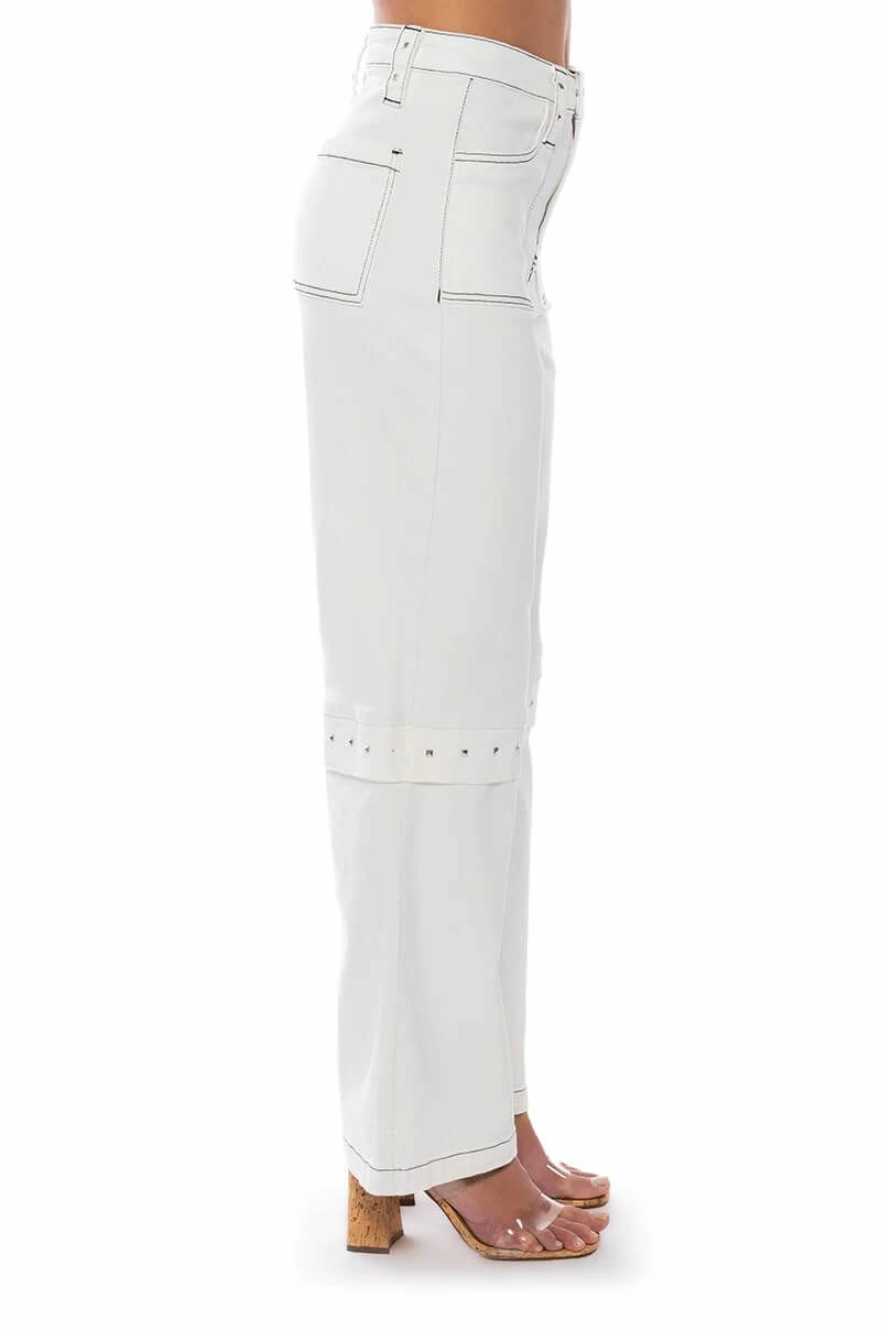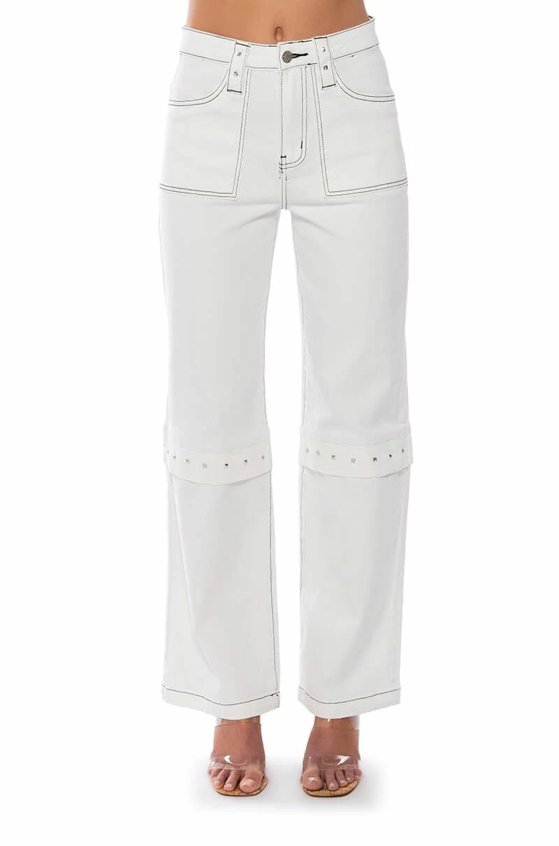 The AKIRA Label Addy Studded Hardware Relaxed Fit Jeans are made from a structured denim fabrication and feature a high rise waist, a four-pocket design, contrast stitching, a relaxed fit silhouette, and a front button and zipper closure. Complete with studded spike detailing along the belt loops and knees.