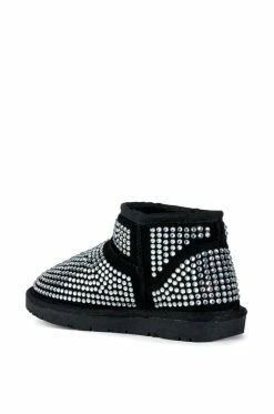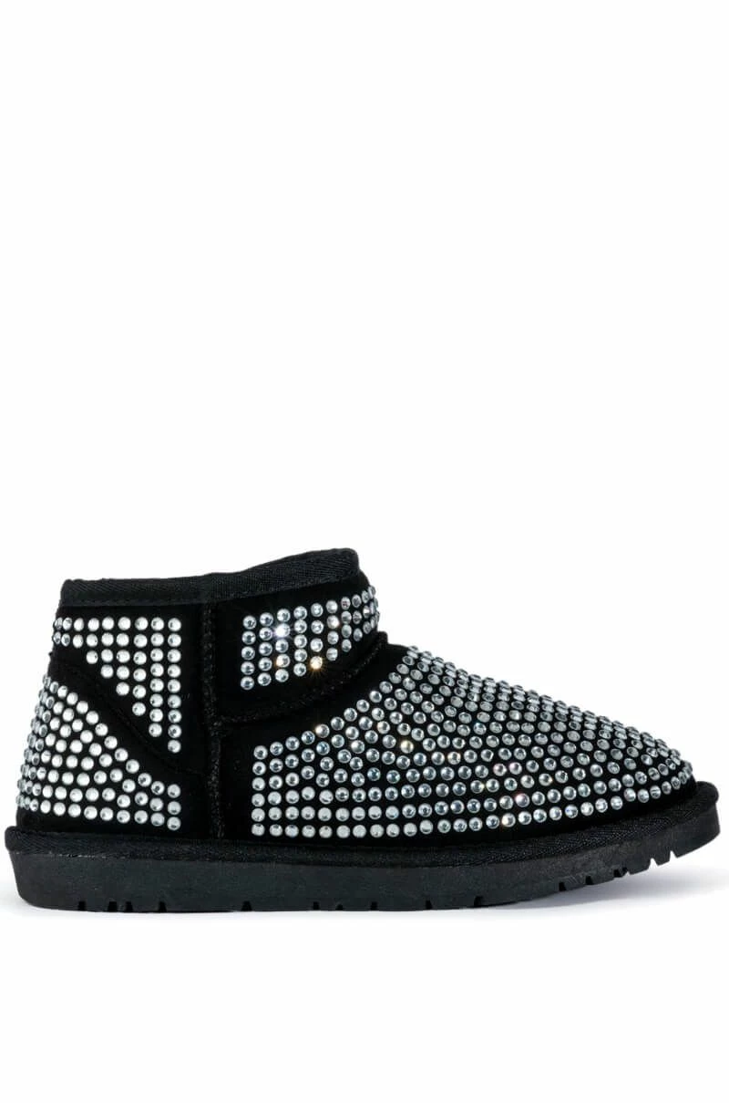 Add some whimsy to your cool weather wardrobe with The AKIRA Label Fairytale Bling Bootie In Black. This super soft and structured faux suede ankle boot features a faux fur lining, an ankle height shaft, a rounded toe, and glittering rhinestone detailing throughout. Wear with your favorite distressed denim and knits to this fall.