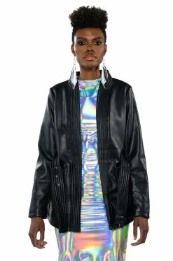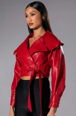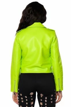 The AKIRA Label Alter Ego Moto Jacket in Light Green is a classic faux leather jacket featuring a wide lapel, long sleeves, zip cuff detao;omg, a front zip closure, slant side zip pockets, silver hardware, and snap details. Complete with a waist length silhouette. a coordinating waist belt, and a smooth inner lining.