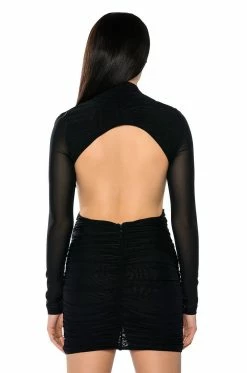 The AKIRA Label Always For You Ruched Mini Dress is made from a sheer, lightweight fabrication and features a plunging neckline, shoulder cutouts, long sleeves, a ruched, layered skirt, a bodycon fit, a sexy open back, a mini length silhouette, and a tonal back zipper closure. Pair this sultry piece with stiletto pumps and a small shoulder bag to complete your look.