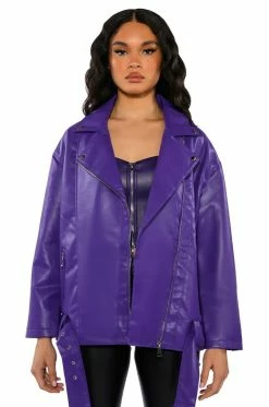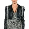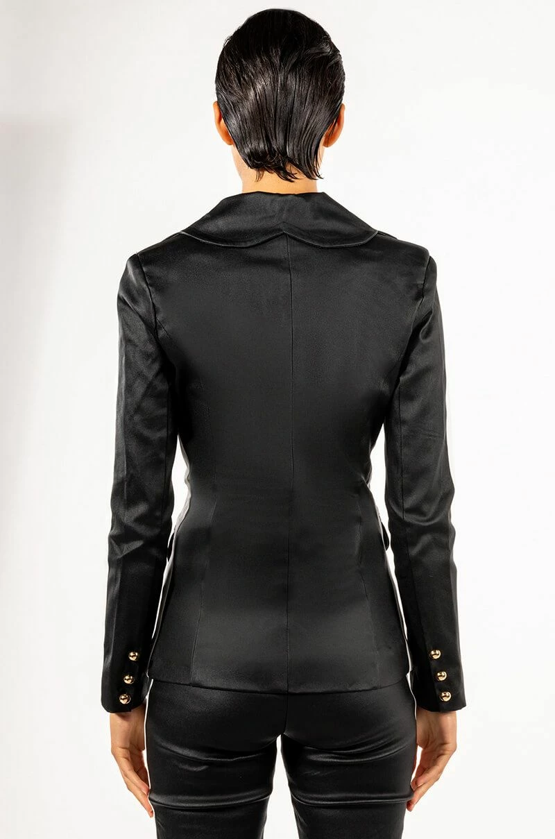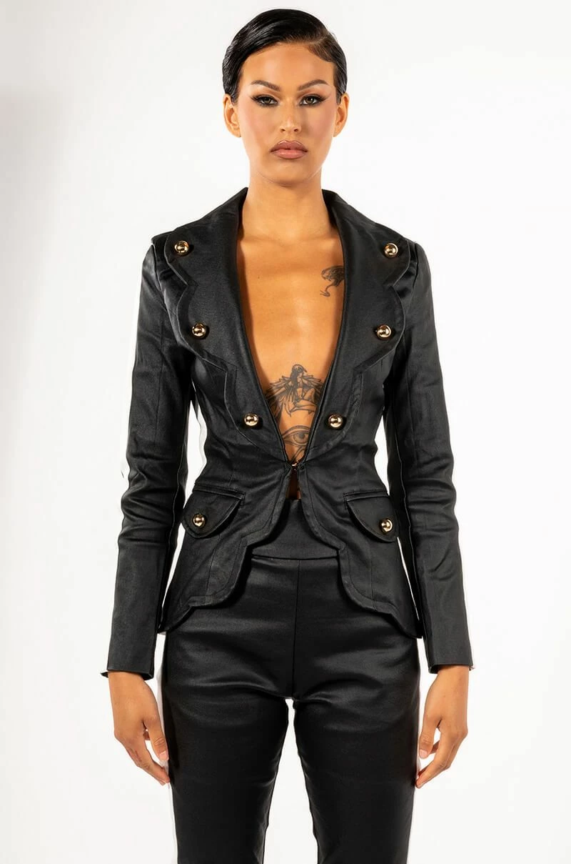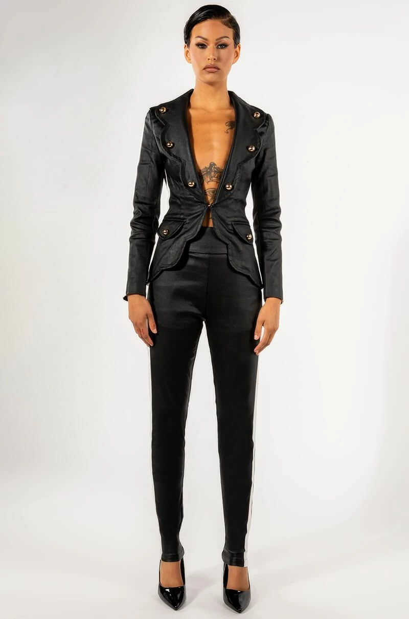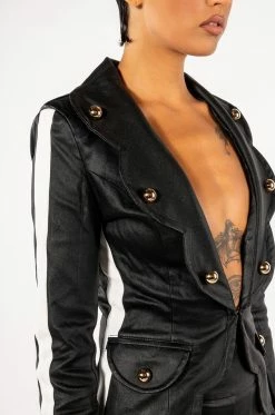 The AMMO X AKIRA Earn Your Stripes Pleather Blazer is made from a stretchy pleather fabrication and features a scalloped wide lapel collar with gold metal ball buttons, colorblock stripes along the sleeves and sides, long sleeves with gold metal ball buttons, princess seam detailing, front rounded flap pockets with gold metal ball buttons, polyester lining, and a scalloped, rounded hem. Complete with a single metal hook and eye front closure. Pair this piece with the coordinating AMMO X AKIRA Big Booty High Waist Pleather Pant With Side Stripe and pumps to finish off your sexy, tailored look.