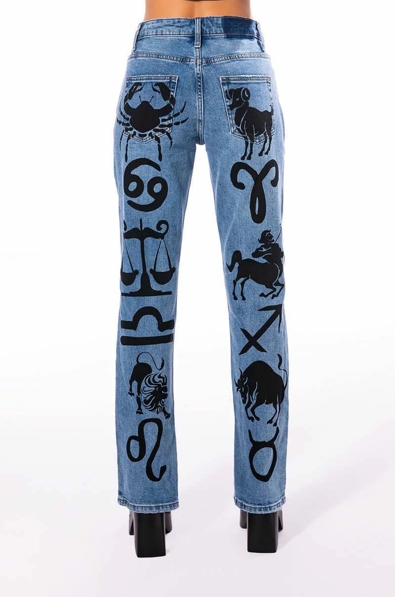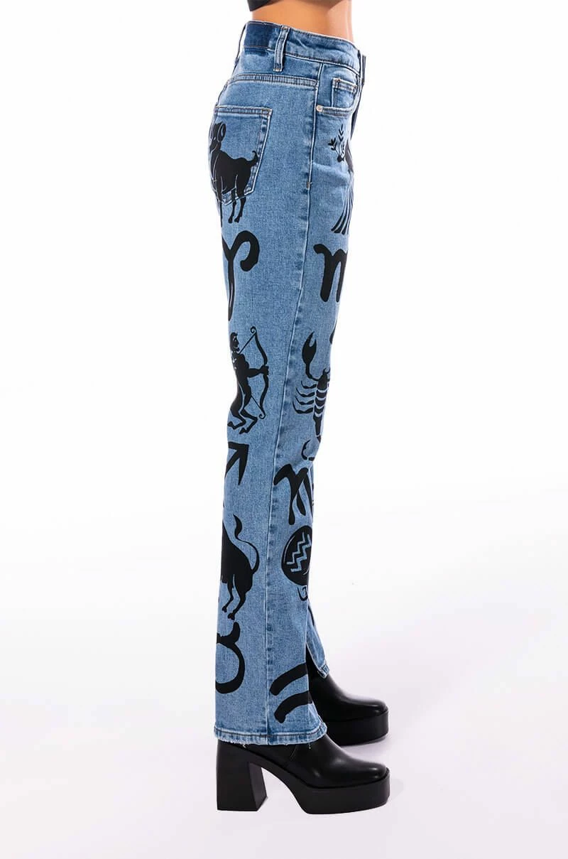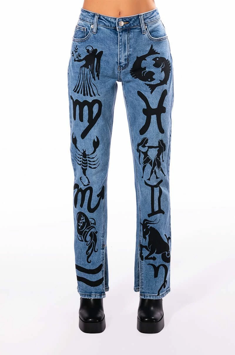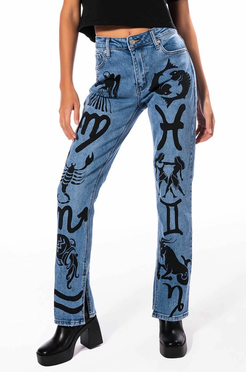 Read everybody’s charts with ease in The AKIRA Label Astrological Printed High Rise Straight Leg Jean! These bottoms are made from a structured washed denim fabrication and feature a painted-style zodiac symbols print front and back, a high rise waist, working belt loops, a classic five-pocket design, a straight leg silhouette, ankle slits, and a front button and zipper closure. Pair this graphic piece with a mock neck top and booties to complete your look.