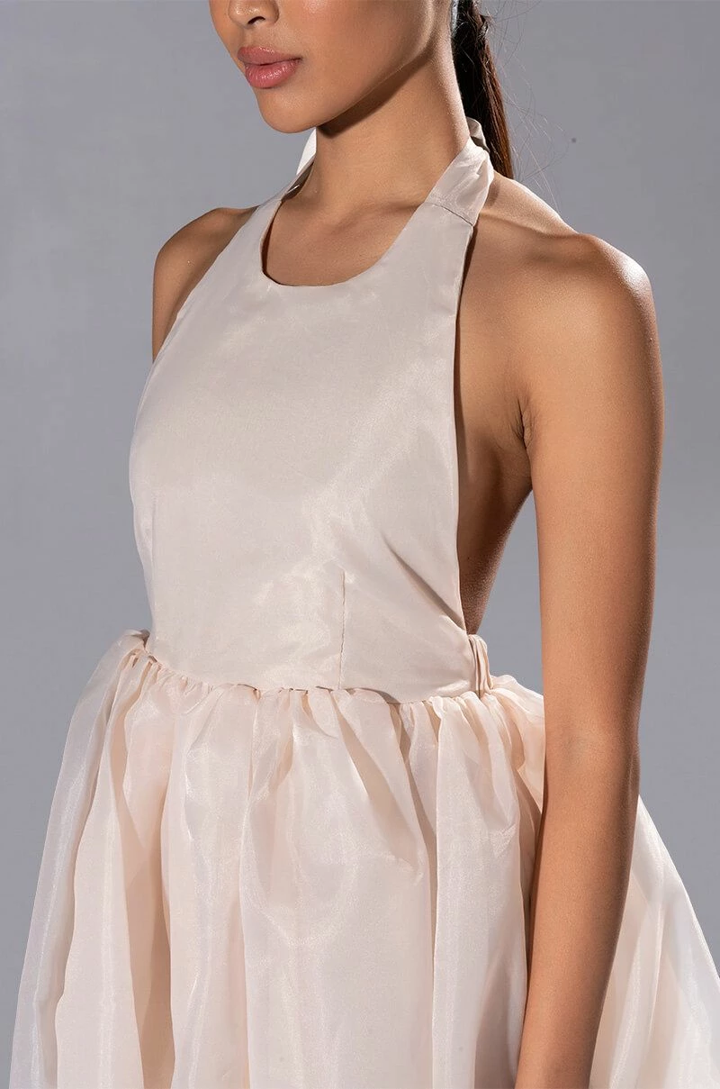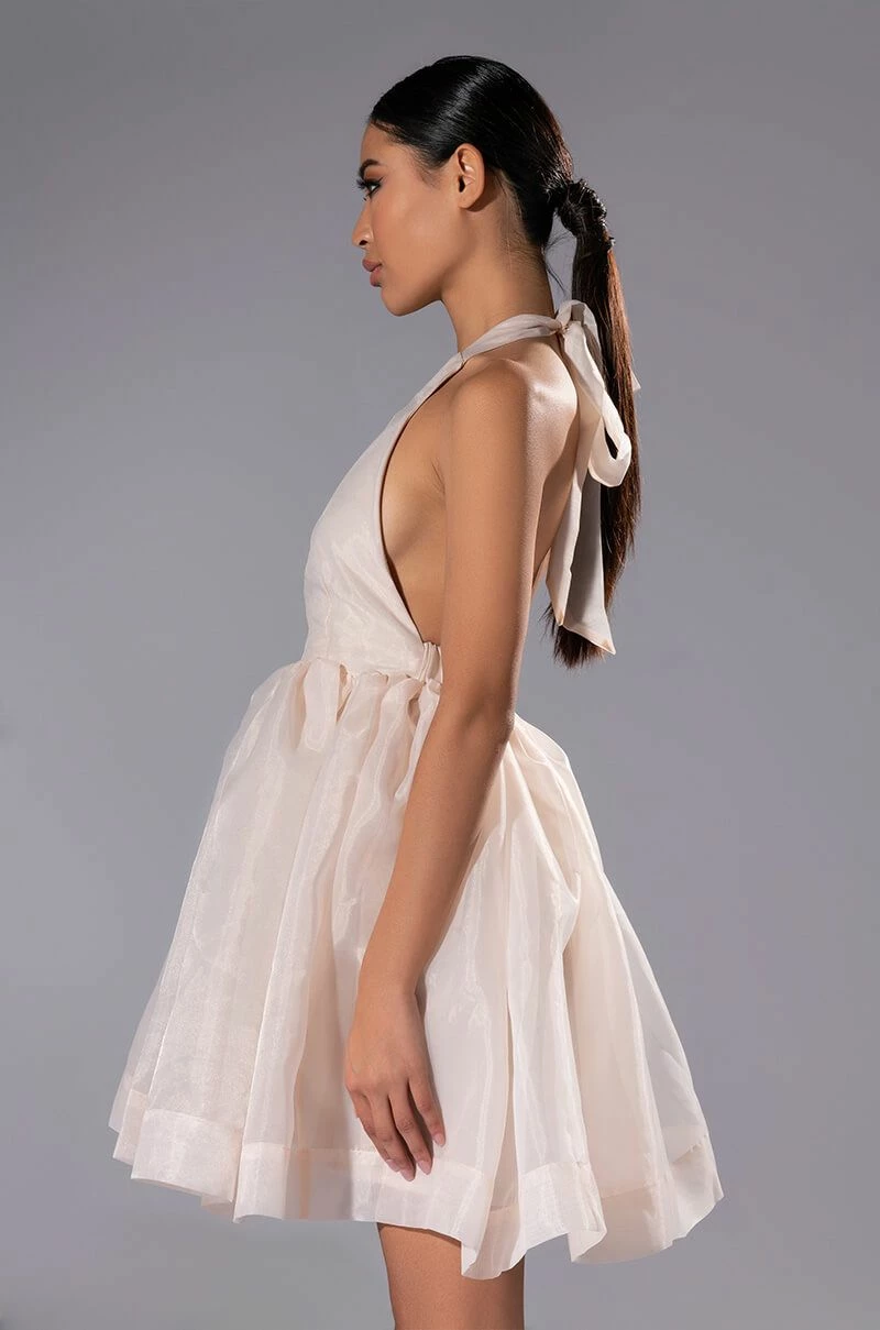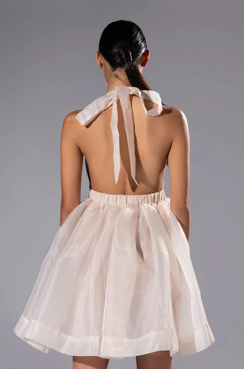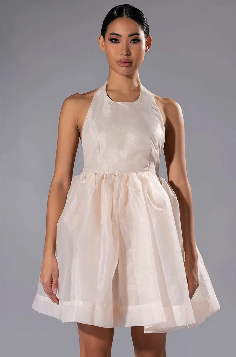 The AKIRA Label At The Show Halter Mini Dress is made from a shimmery fabrication and features a tie halter neckline, a sleeveless design, princess seam detailing, an elastic back waistband, a flared skirt with cotton lining, an open back, and a mini length silhouette. Pair this star-studded piece with pumps and a clutch to complete your look.