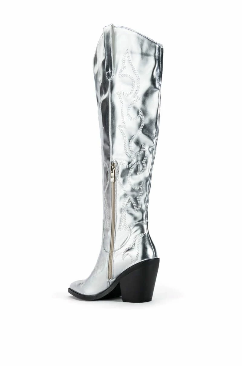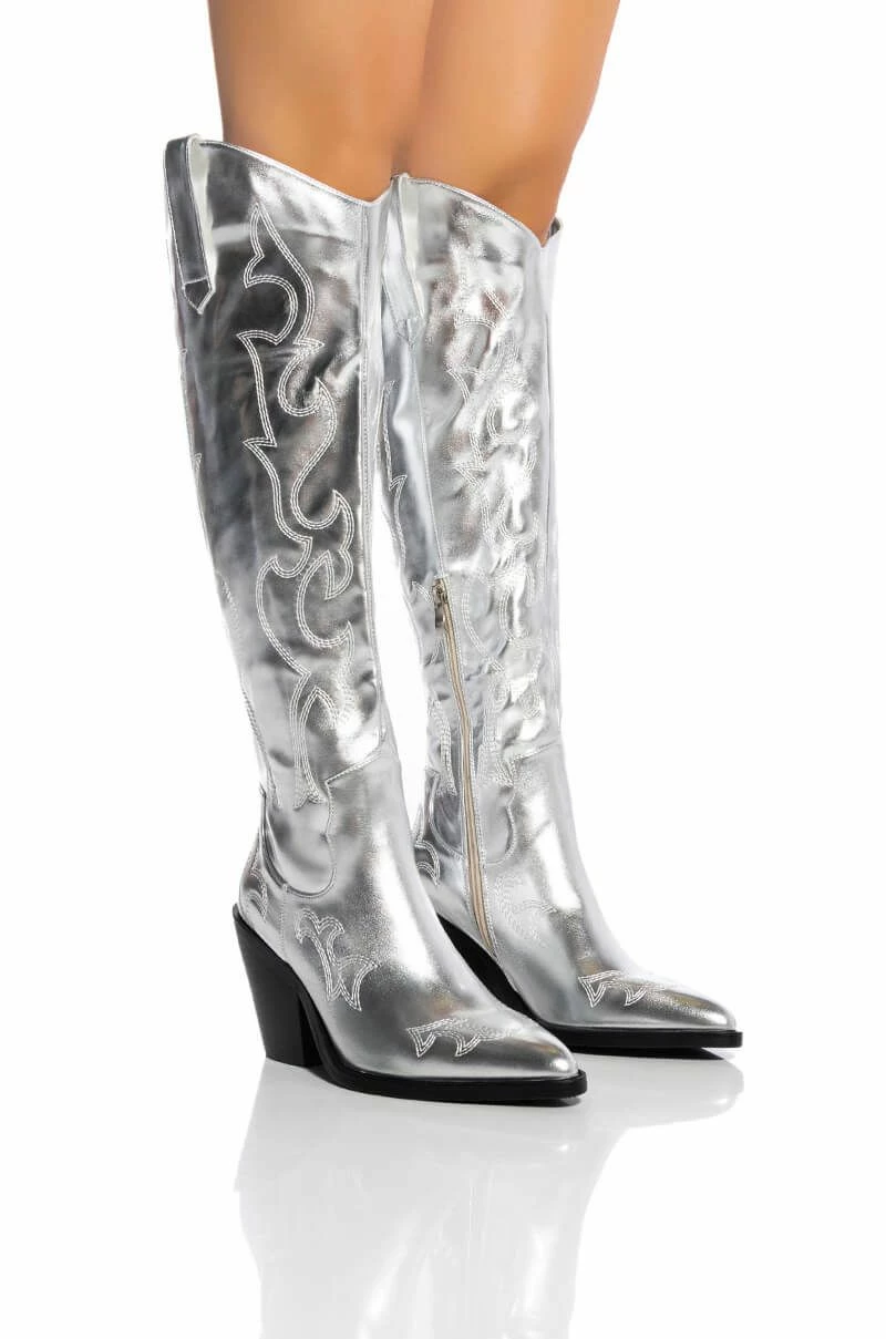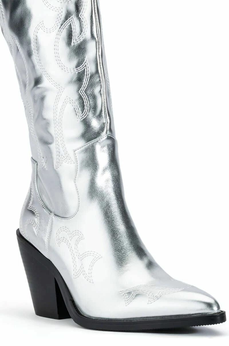 What’s the move? Meet your besties at the second location in style with The AZALEA WANG After Party Metallic Western Boot in Silver. This glam metallic cowboy boot features a vegan leather upper, a pointed toe, a knee high silhouette, a rounded Western-inspired shaft. Complete with tonal Western-inspired embroidery, a chunky block heel, and slip-on fit. Pairs perfectly with everything from denim and crop tops to dresses and moto jackets.