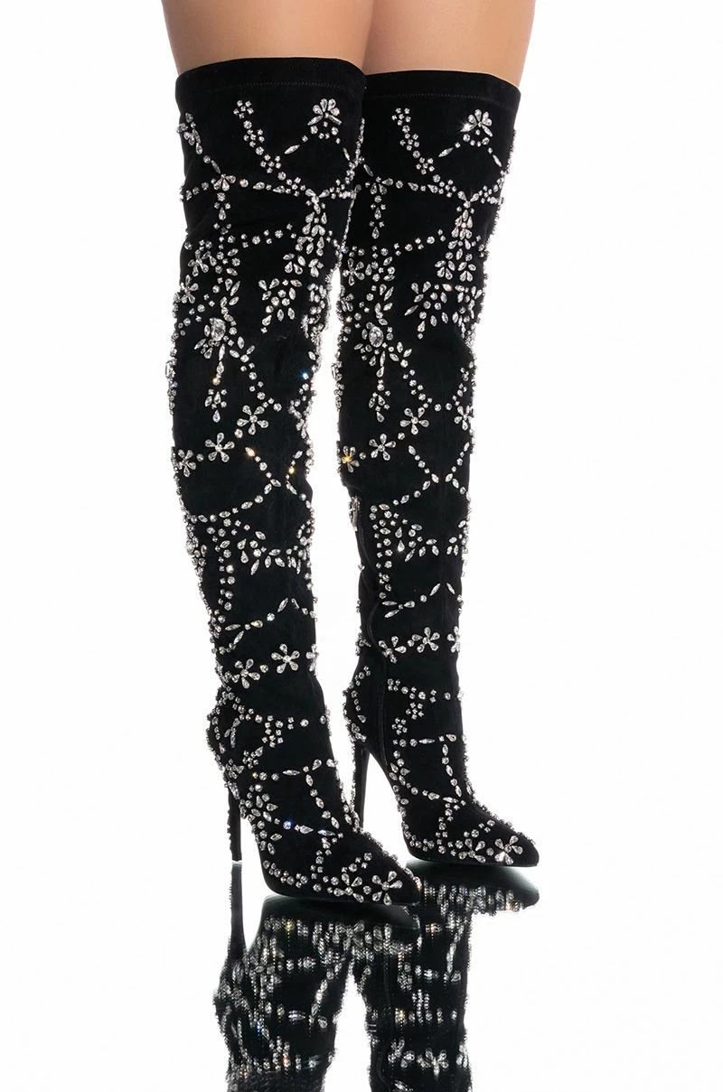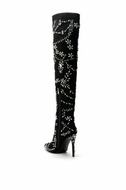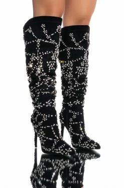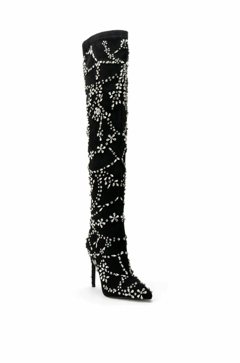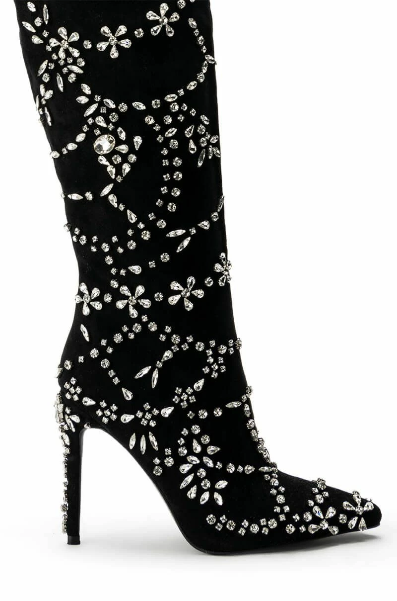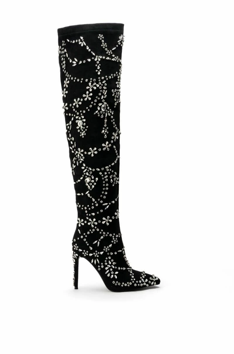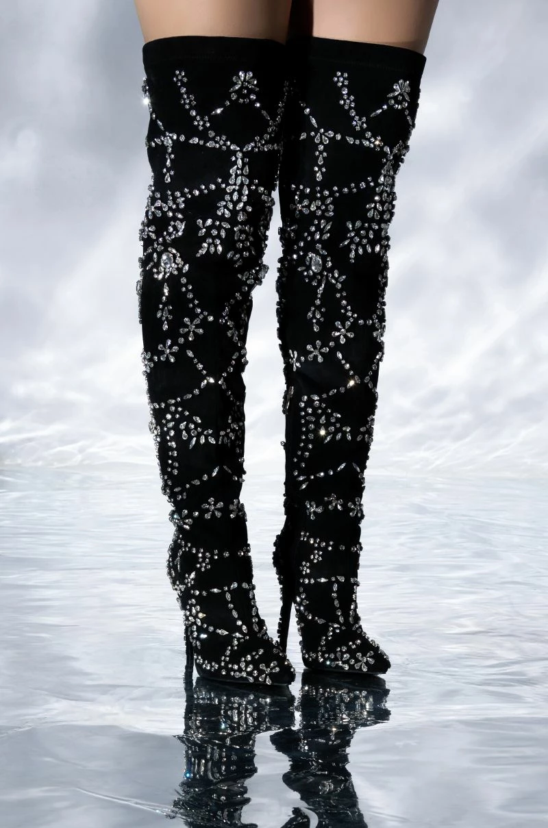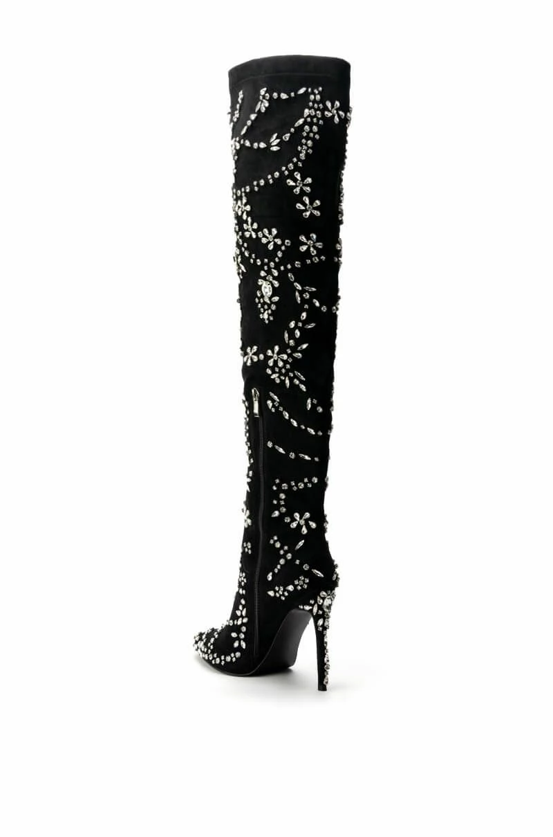 The AZALEA WANG Ageless Rhinestone Stiletto Boot In Black Suede is made from a chic suede upper and features patterned rhinestone detailing, a thigh-high silhouette, a pointed toe design, and a rhinestone-detailed stiletto heel. Complete with an inner ankle zipper closure.