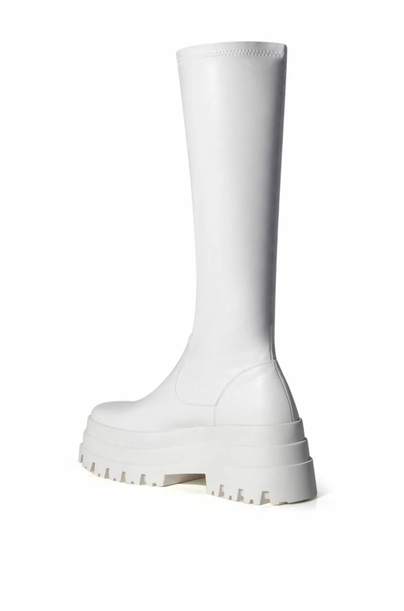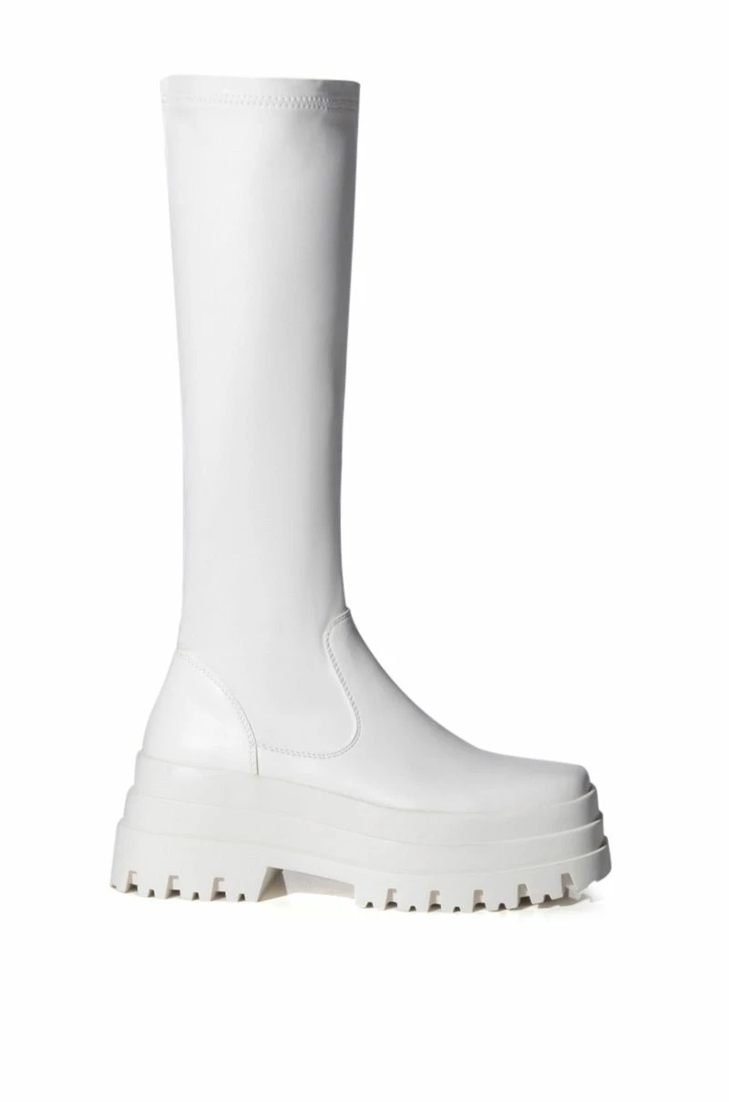We’re in LOVE with The AZALEA WANG Aretha Stretch Boot With 4 Way Stretch In White! It features a smooth faux leather upper, a super stretchy, leg hugging upper, a PU covered mid calf shaft height, and a pull on fit. Complete with a square toe silhouette, a chunky flatform rubber base, and a ridged lug sole, perfect for walking around snowy streets.