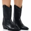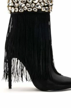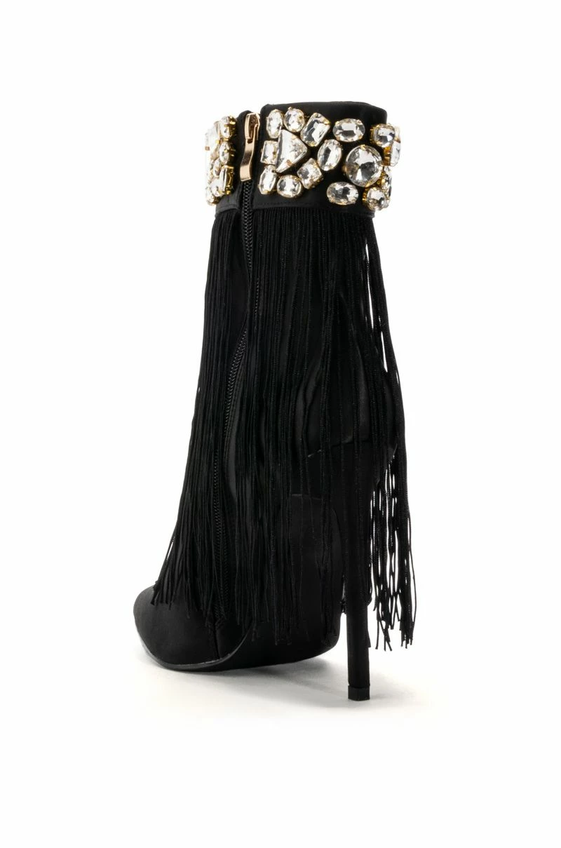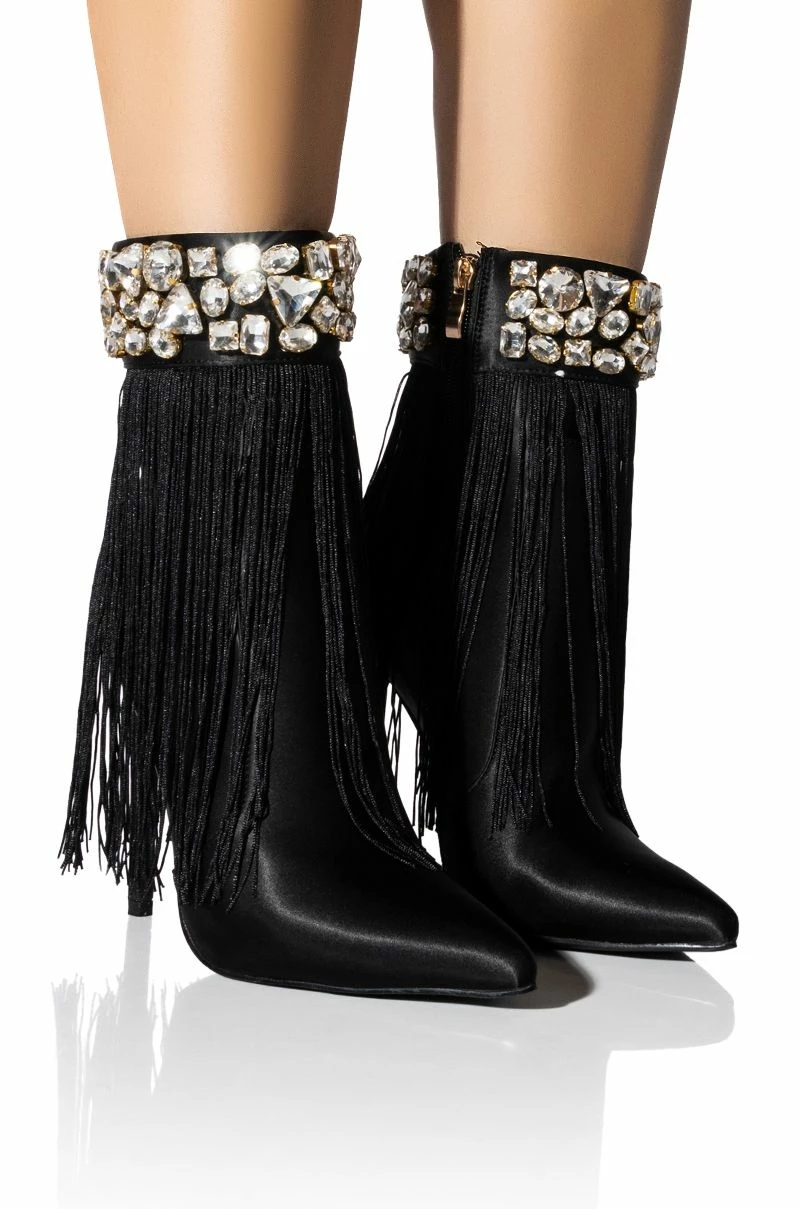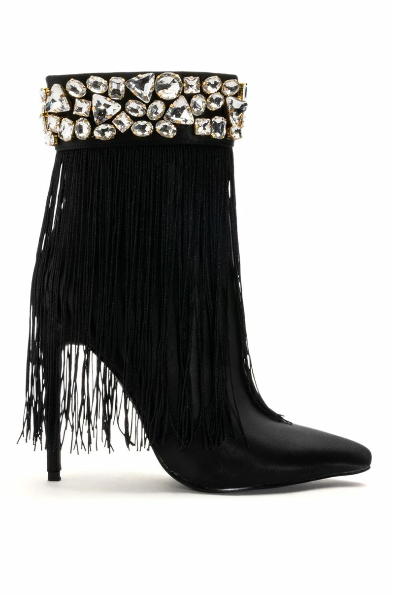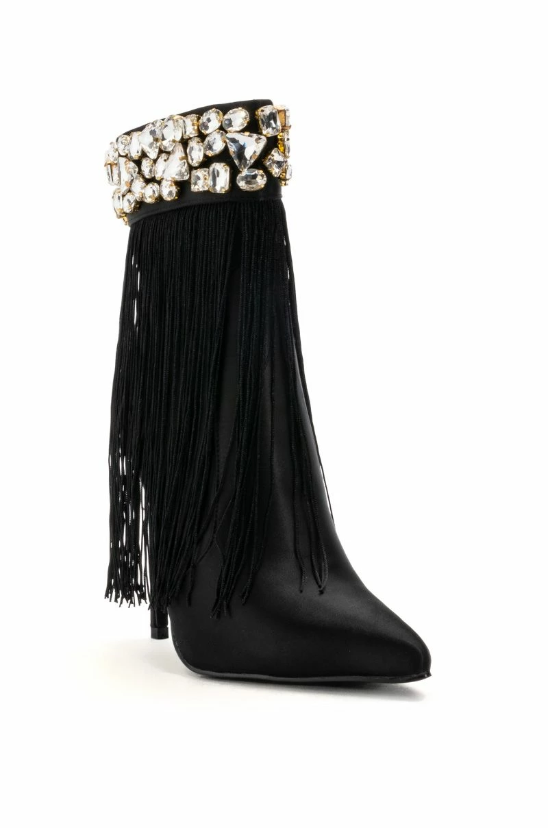 The AZALEA WANG Averi Embellished Fringe Bootie In Black is made from a slick satin upper and features a mid-calf height shaft, a wide, scattered gem-embellished top band with fringe trim, a pointed toe silhouette, and a stiletto heel. Complete with an inner ankle zipper closure.