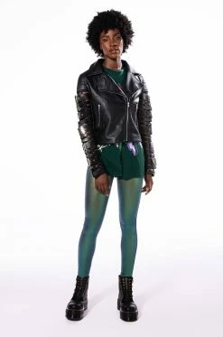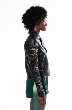 Get ready for a killer outfit. The AZALEA WANG Buckle Up Moto Jacket features a vegan leather fabrication, a notched collared neckline, zippered slant side pockets, silver metallic hardware, and a zip front design. Complete with long cut out sleeves with intricate buckle detailing and an adjustable buckled waist belt and a satin inner lining. Style this jacket with a pair of leather pants and stiletto booties for a sexy chic look!