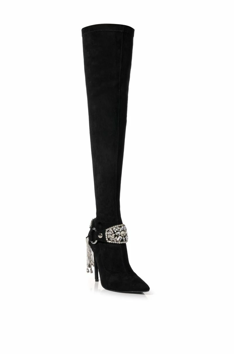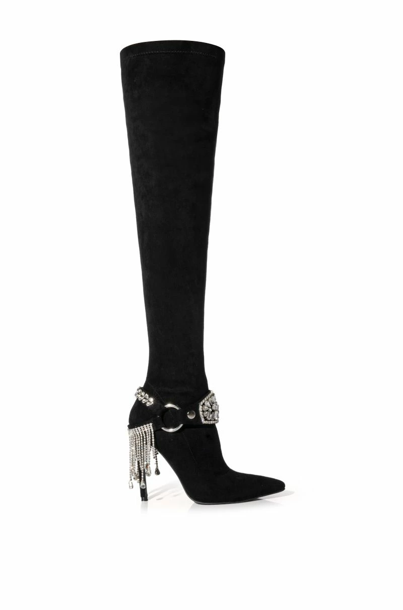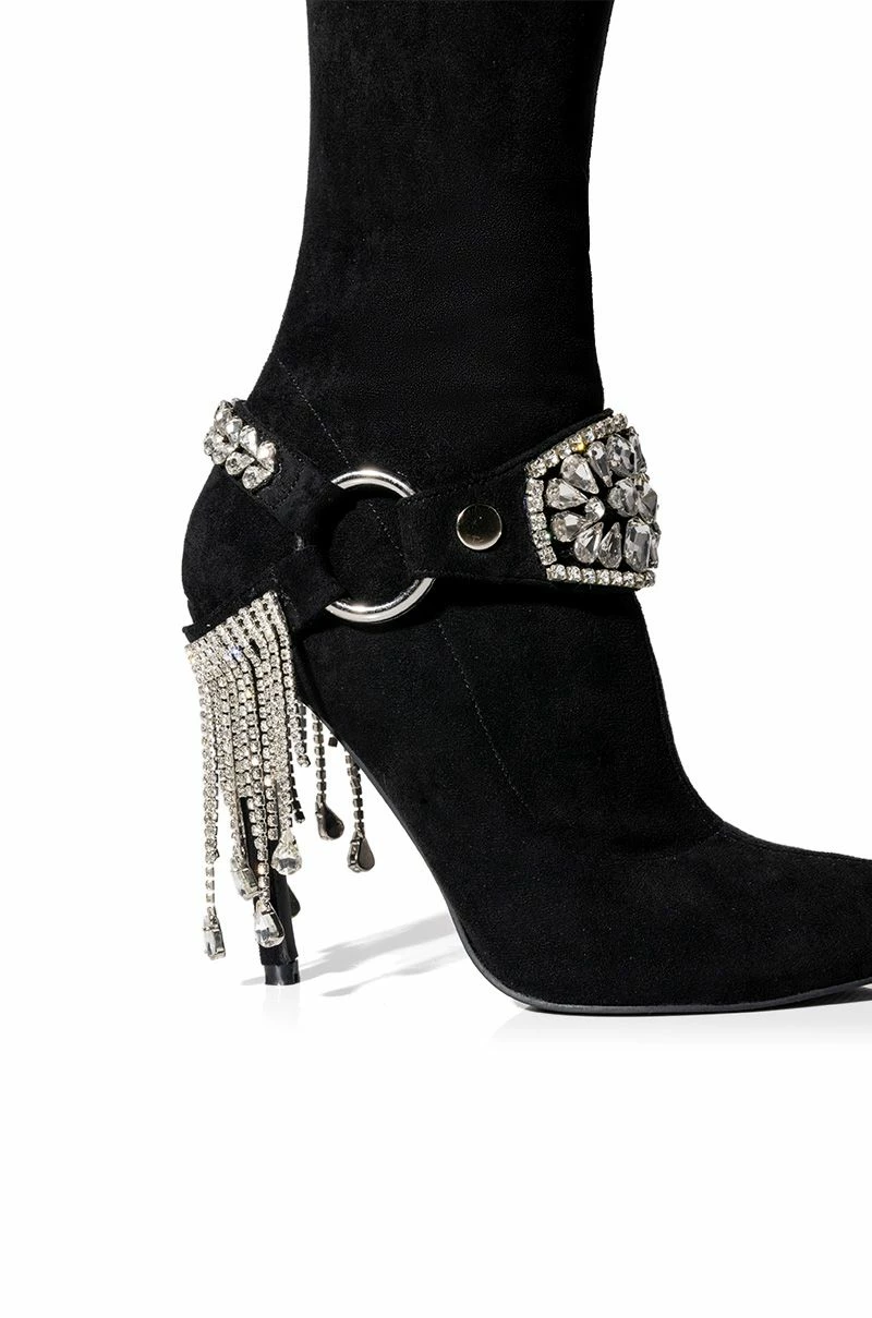 The AZALEA WANG Caesar Knee High Rhinestone Fringe Boot In Black is made from a smooth suede upper and features a knee-high shaft, a pointed toe silhouette, an ornate rhinestone fringe belt detail, and a stiletto heel. Complete with an inner ankle zipper closure.