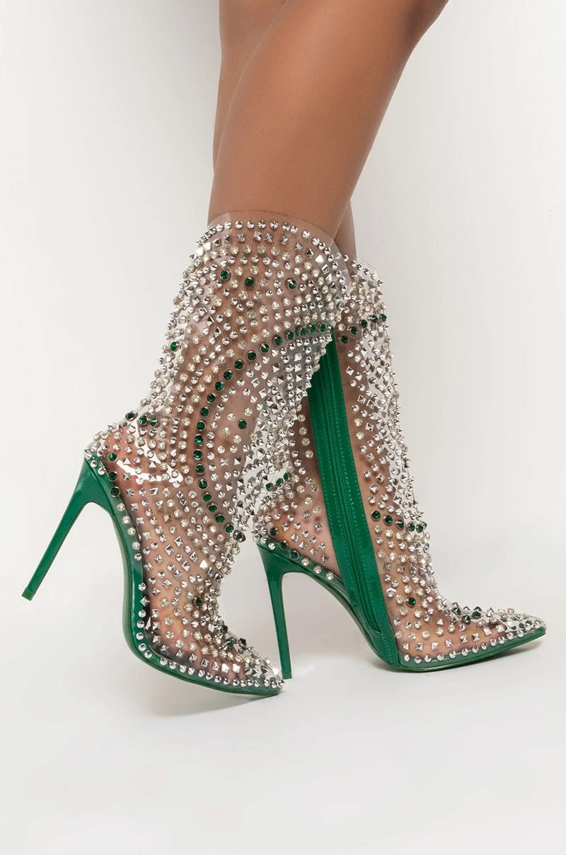 All eyes on you! The AZALEA WANG Center Of Attention Western Stiletto Boot in Green is a glimmering mid-calf bootie featuring a PVC upper, patent midsole, Western-inspired silhouette, and slim stiletto heel. Complete with a pointed toe, elaborate silver-tone studded detailing, rhinestone gemstone accents, and an inner ankle zipper closure.