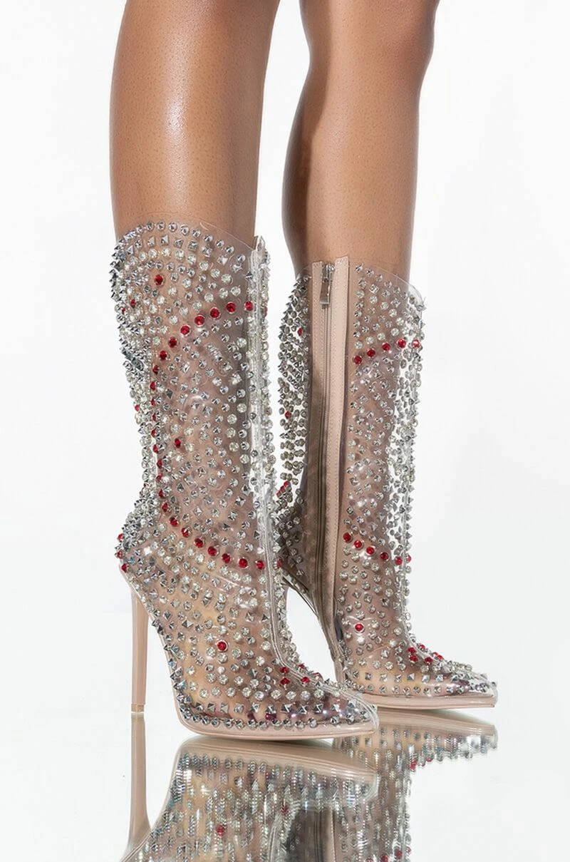All eyes on you! The AZALEA WANG Center Of Attention Western Stiletto Boot in Nude is a glimmering mid-calf bootie featuring a PVC upper, patent midsole, Western-inspired silhouette, and slim stiletto heel. Complete with a pointed toe, elaborate silver-tone studded detailing, rhinestone gemstone accents, and an inner ankle zipper closure.