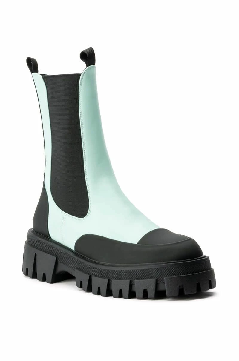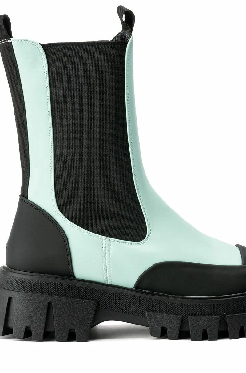 The AZALEA WANG Crazy Like Me Flatform Bootie In Blue features a vegan leather upper, a mid calf shaft height, a textured outsole, tonal stitching, and a flatform rubber base. Complete with elastic side panels and a back ankle loop for an easy slip on fit. Style these with a pair of straight leg pants and your favorite tee.