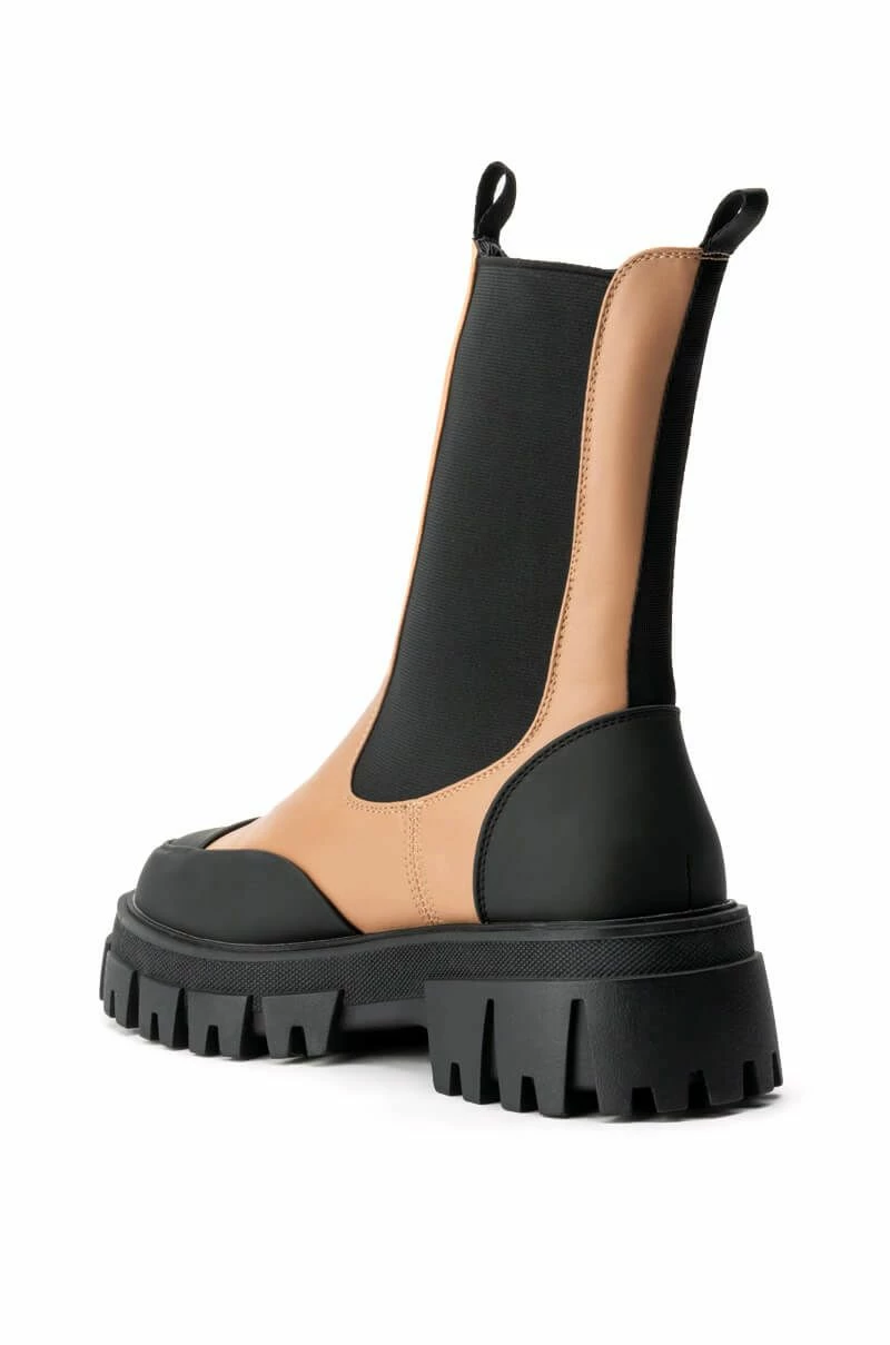 The AZALEA WANG Crazy Like Me Flatform Bootie In Sand features a vegan leather upper, a mid calf shaft height, a textured outsole, tonal stitching, and a flatform rubber base. Complete with elastic side panels and a back ankle loop for an easy slip on fit. Style these with a pair of straight leg pants and your favorite tee.