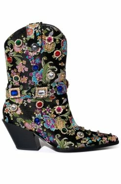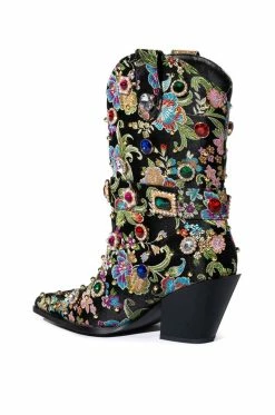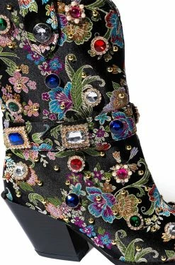 The AZALEA WANG Diligent Gem Embellished Brocade Western Bootie In Black is made from a floral-patterned brocade upper and features studded and rhinestone gem embellishments, a coordinating velcro belt detail, a rounded, Western-inspired silhouette, a mid-calf height shaft, a pointed toe design, pull tabs, a chunky heel, and a pull-on fit.