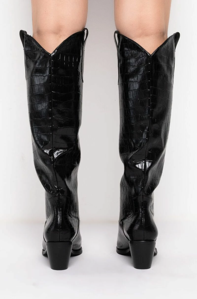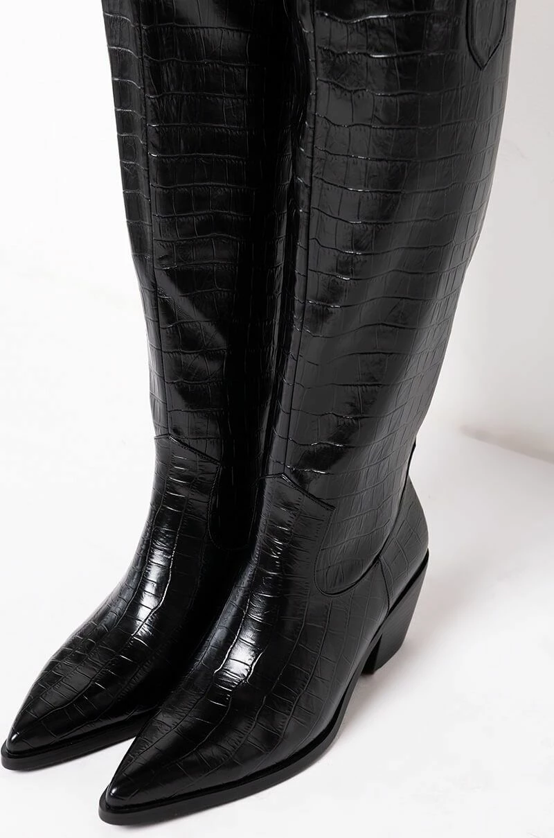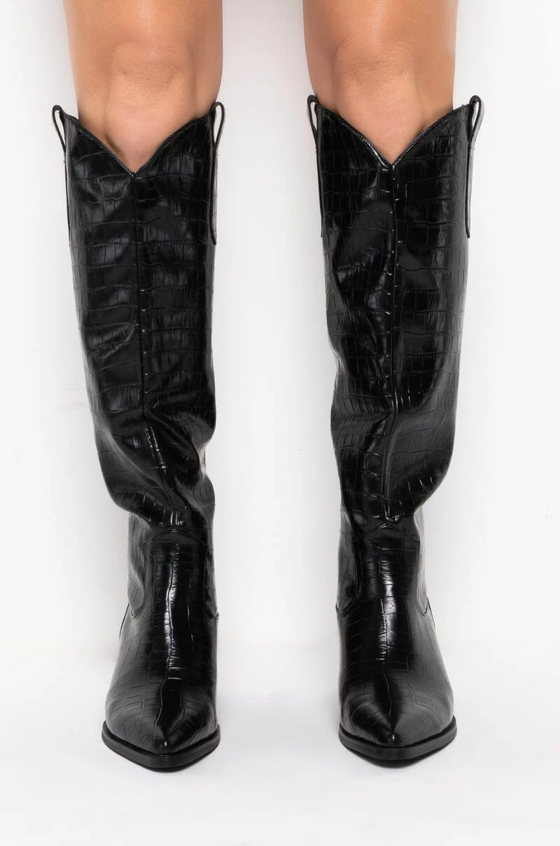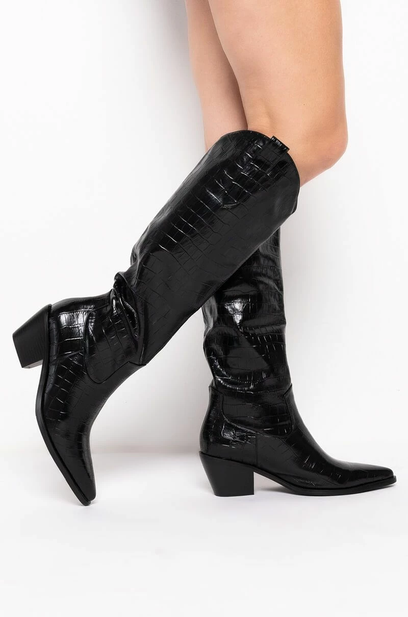 The AZALEA WANG Down Under Chunky Western Boot in Black is a goes-with-everything shoe featuring a croc-embossed faux leather upper, pointed toe, below the knee length, a rounded Western-inspired shaft silhouette, chunky block heel, and a slip-on fit.
