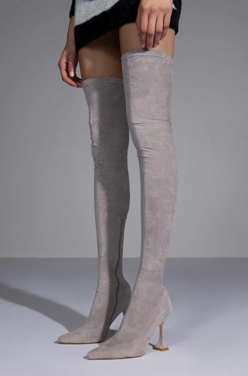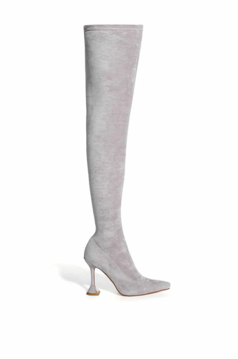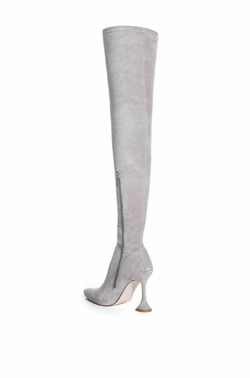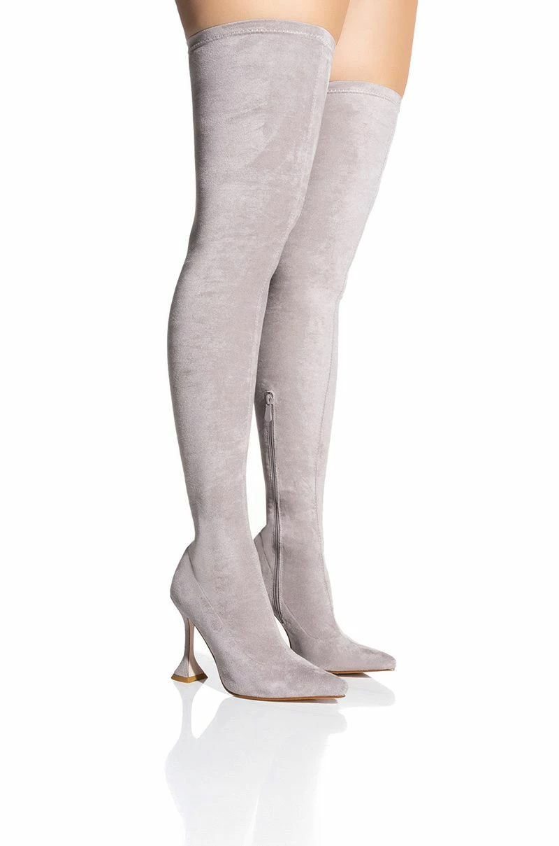 Vibrate higher with The AZALEA WANG Elevate Thigh High Stretch Suede Boot In Grey! This sexy, curve-hugging boot is made from a stretchy faux suede upper and features a pointed toe design, thigh high shaft, a sculpted stiletto heel, nude soles, and an inner ankle zipper closure.