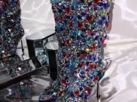 The AZALEA WANG Ember Rhinestone Denim Stiletto Boot In Multi is made from a clustered, multicolor rhinestone-detailed upper and features a pointed toe silhouette, a knee-high shaft, and a metallic stiletto heel. Complete with an inner ankle zipper closure.