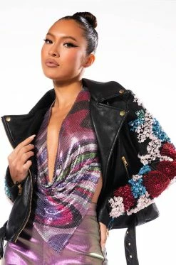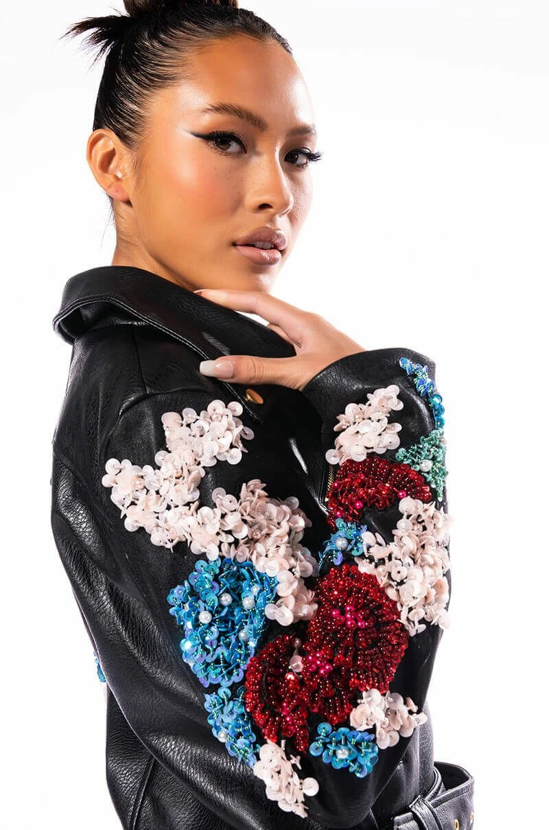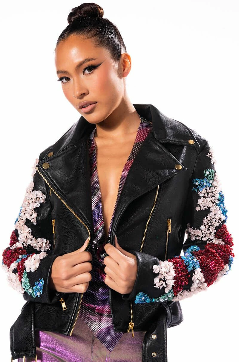 The AZALEA WANG Every Rose Has A Thorn Moto Jacket is made from a textured vegan leather fabrication and features a studded notch collar, mesh overlay long sleeves with zippered wrists and flower-patterned sequin and pearl detailing, front zipper pockets, polyester lining, and belt loops with an adjustable, coordinating vegan leather waist belt. Complete with a front zipper closure.