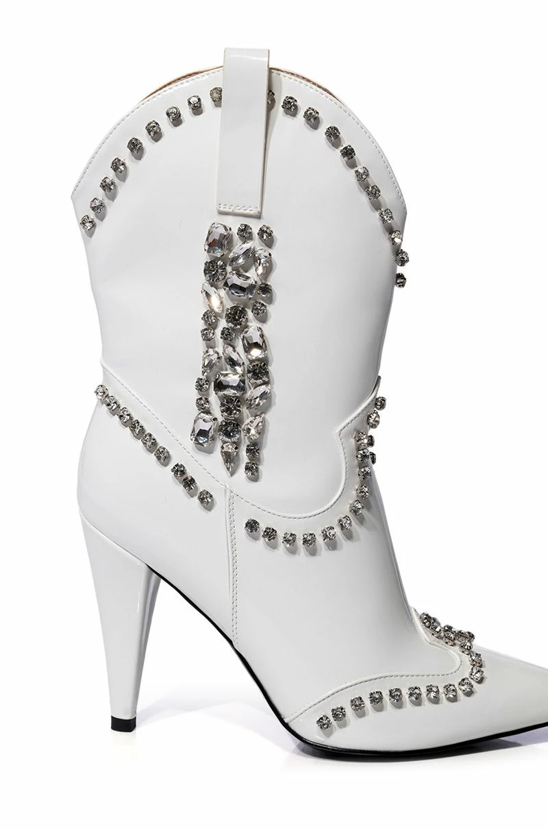 The AZALEA WANG Freida Embellished Western Stiletto Bootie In White is made from a vegan patent leather upper and features a Western-inspired design, a mid-calf height shaft, a pointed toe silhouette, pull tabs, and a stiletto heel. Complete with embroidered Western stitching with rhinestone trim and clustered side rhinestone gem detailing.