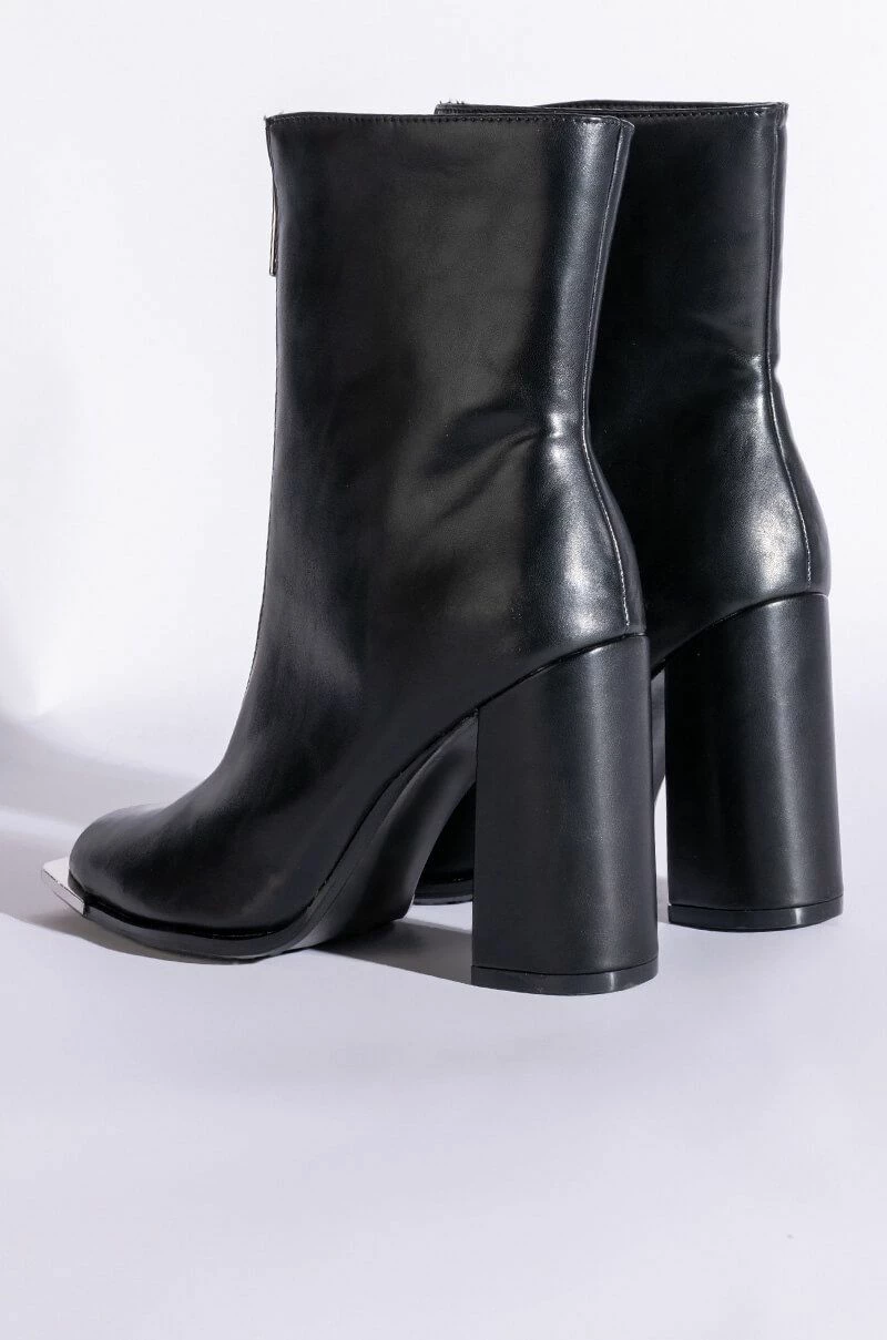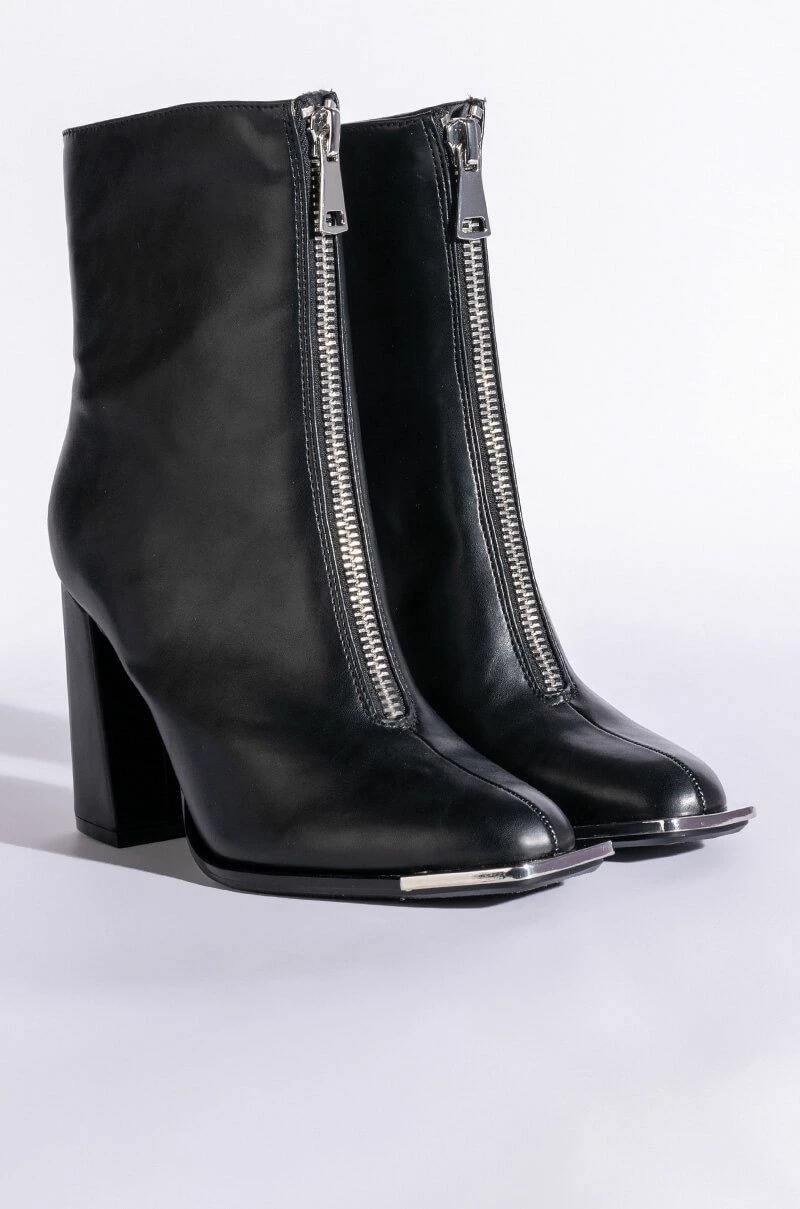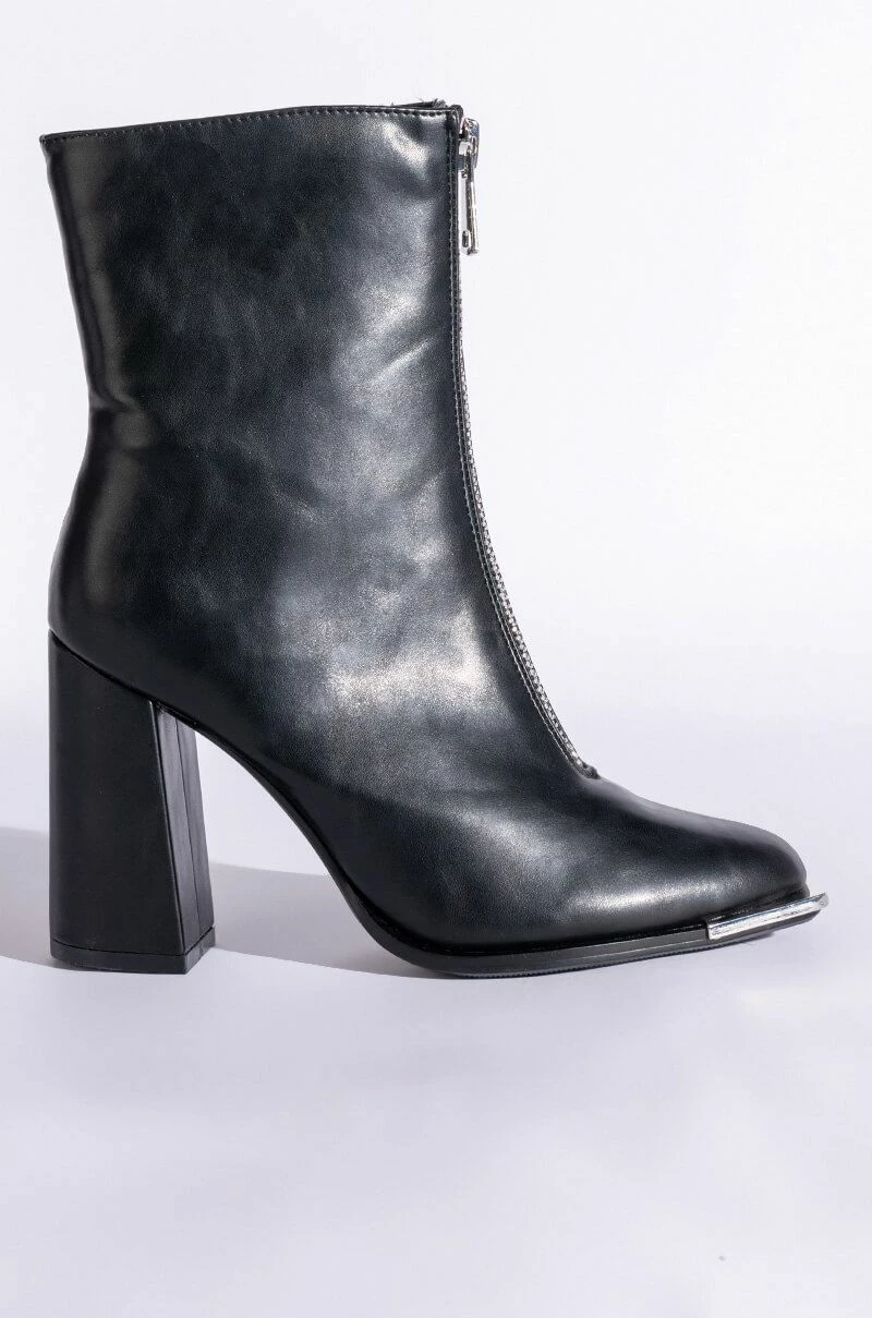 A work of art from any angle. The AZALEA WANG Fresco Zip Chunky Boot in Black is an ultra-chic mid calf ankle boot featuring a vegan leather upper, an almond toe design, an extended squared metallic sole, a sturdy block heel, and an exposed front zipper closure.