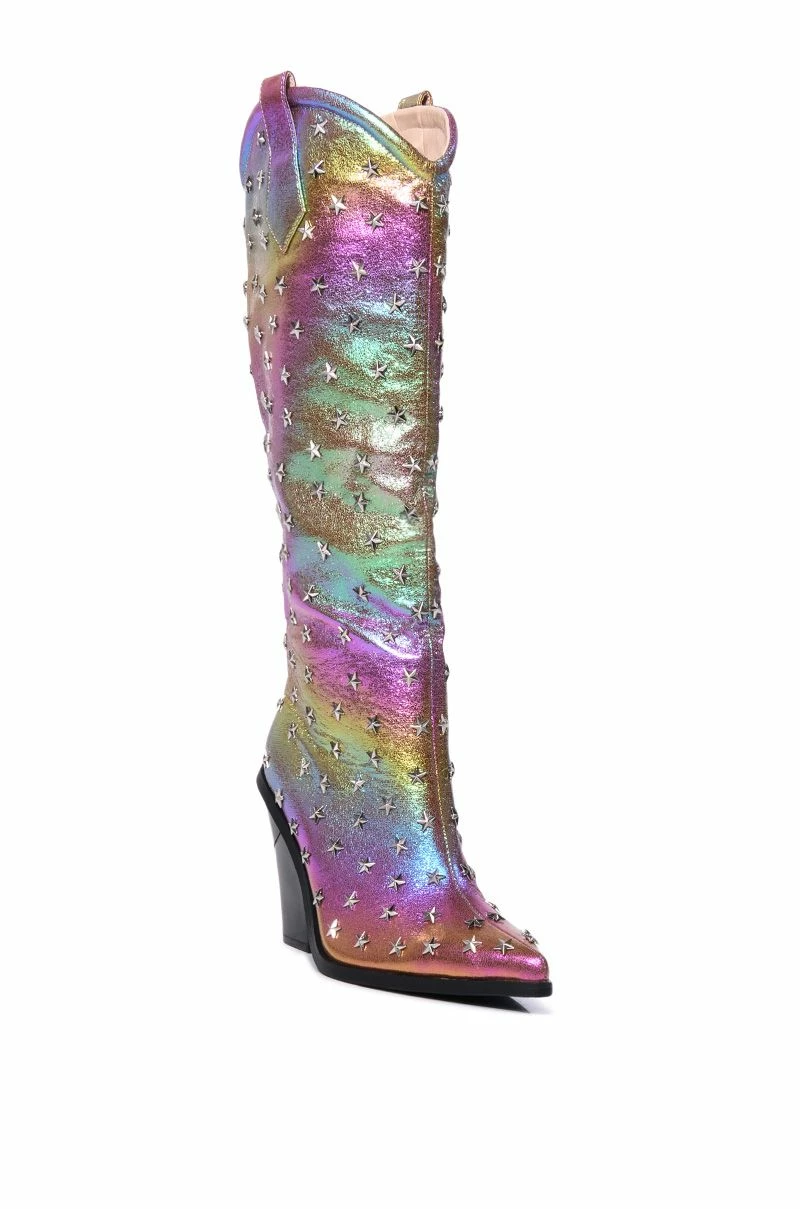 The AZALEA WANG Freya Star Studded Iridescent Western Boot In Purple is made from a shimmering iridescent rainbow faux leather upper and features metal star studded detailing, a pointed toe silhouette, a Western-inspired knee high shaft with side pull tabs, a chunky heel, and a pull-on fit.
