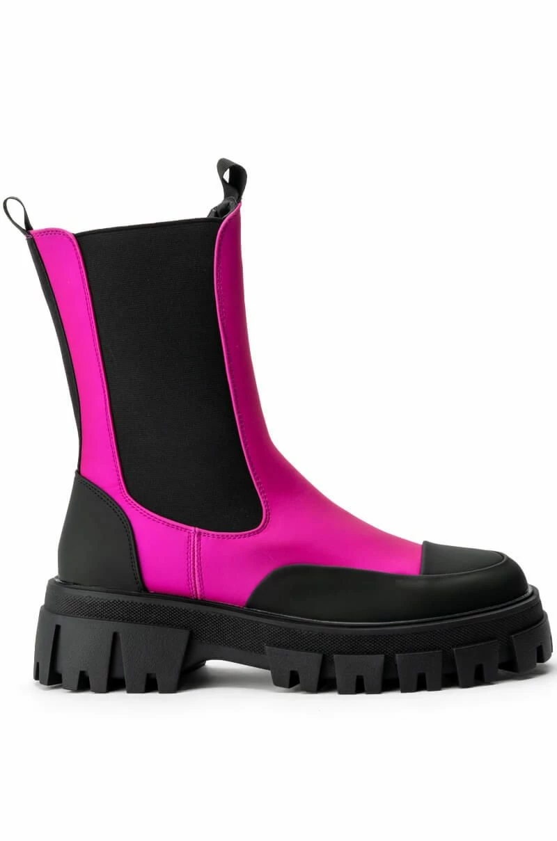 The AZALEA WANG Crazy Like Me Flatform Bootie In Pink features a vegan leather fabrication, mid calf shaft height, a textured outsole, tonal stitching, and a flatform rubber base. Complete with elastic side panels and a back ankle loop for an easy slip on fit. Style these with a pair of straight leg pants and your favorite tee.