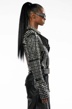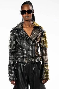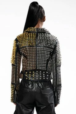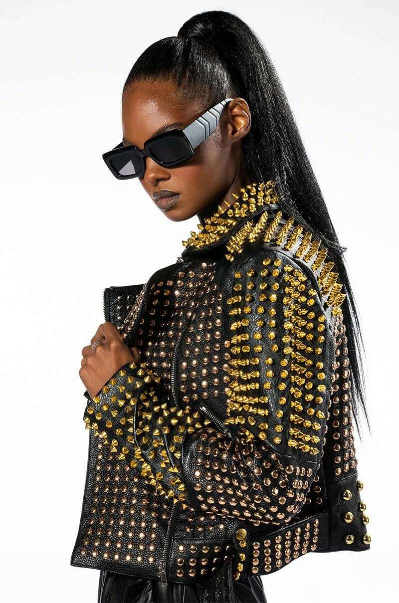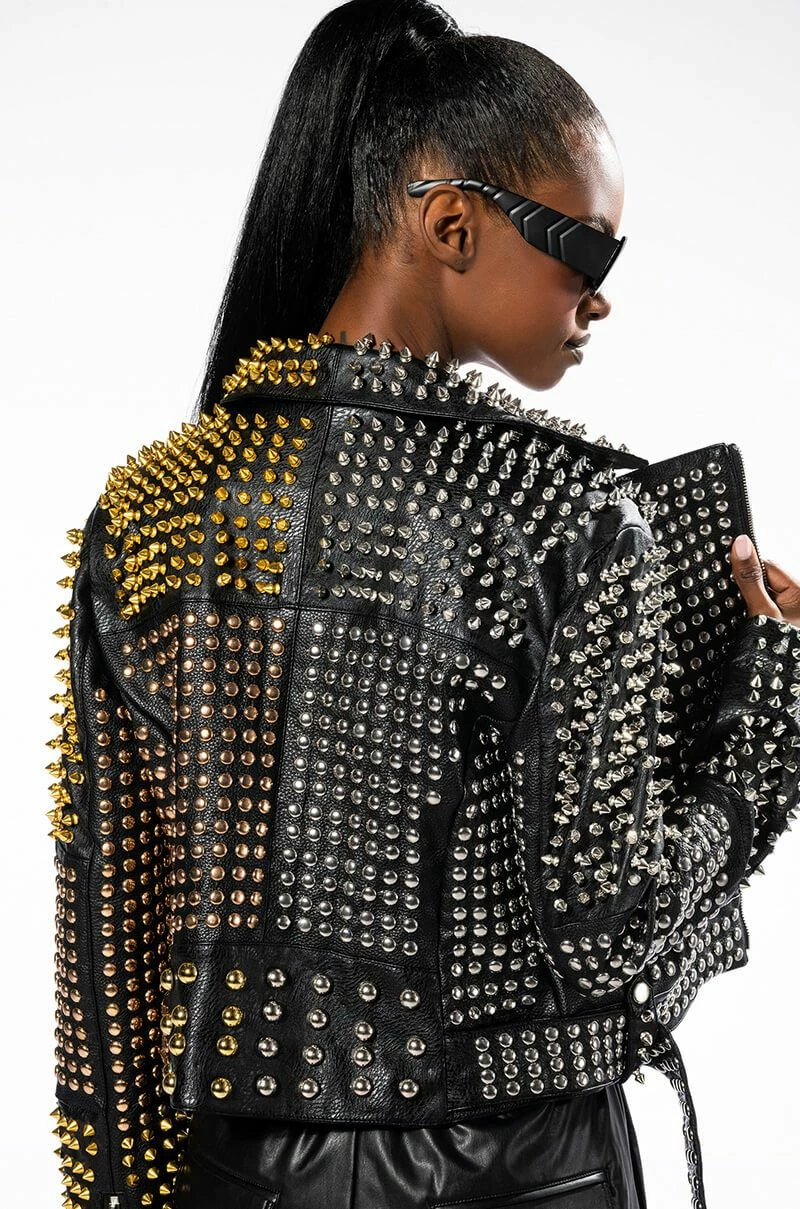 Half bold, half fierce, full glam. The AZALEA WANG Half And Half Grande Studded Moto Jacket is made from a pebbled vegan leather fabrication and features a wide notch collar, silver, gold, and rose gold studded and spiked detailing throughout, long sleeves with zipper wrists, front zipper slant pockets, light polyester lining, and an adjustable, coordinating vegan leather studded waist belt. Complete with a front zipper closure.