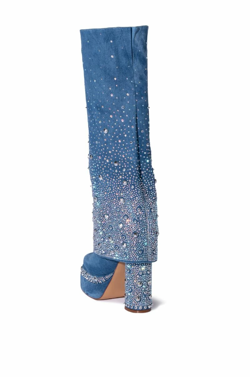 Your style star status is showing. The AZALEA WANG Invisible Denim Boot With Diamonds is a glamorous denim boot featuring a knee high shaft, a fold over shark boot silhouette, an elasticated shaft for ultimate comfort, and a slightly covered chunky heel. Complete with a rhinestone embellishments, silver metallic detailing, a square toe, platform sole, and slip on fit.