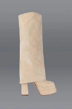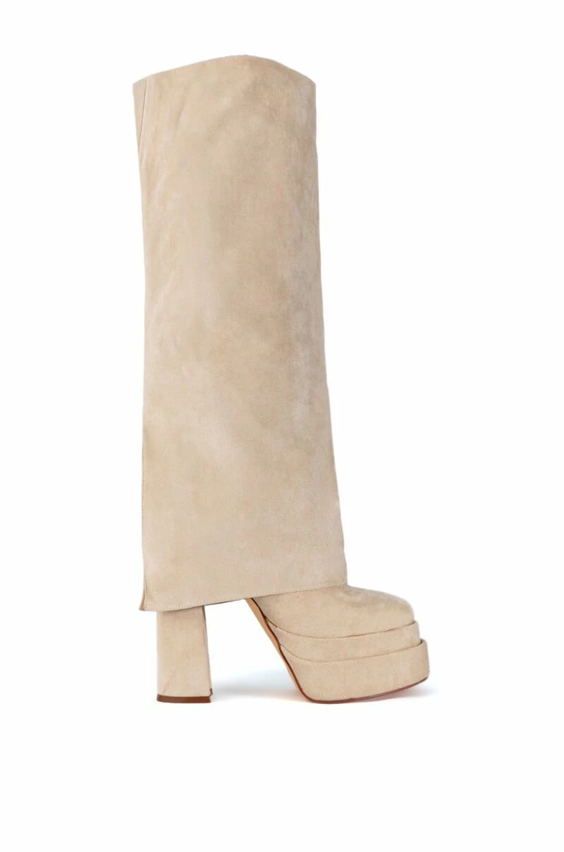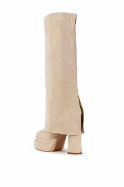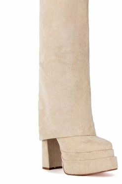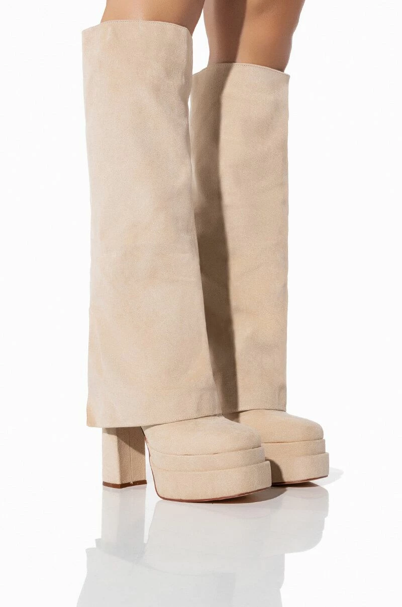 Your style star status is showing. The AZALEA WANG Invisible Fold Over Chunky Boot in Tan Suede is a luscious faux suede boot featuring a knee high shaft, a fold over shark boot silhouette, an elasticated shaft for ultimate comfort, and a slightly covered chunky heel. Complete with a squared toe, platform sole, and slip on fit.