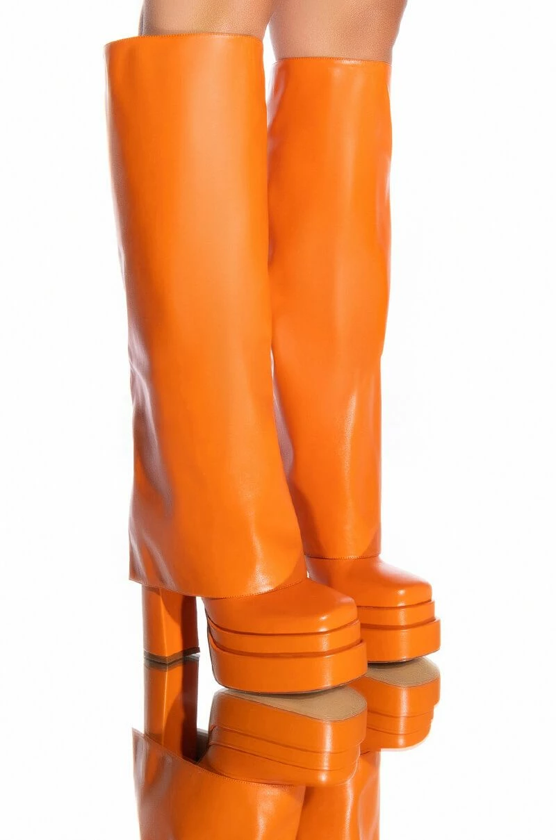 Your style star status is showing. The AZALEA WANG Invisible Knee High Fold Over Chunky Boot in Orange is a luscious vegan leather boot featuring a knee high shaft, a fold over shark boot silhouette, an elasticated shaft for ultimate comfort, and a slightly covered chunky heel. Complete with a squared toe, platform sole, and slip on fit.