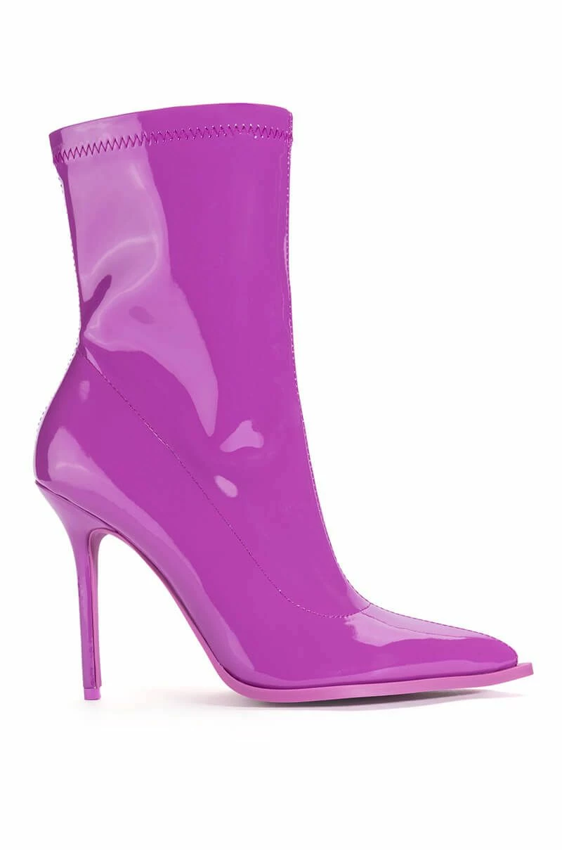 The AZALEA WANG Isabella Patent Bootie In Purple is a chic must-have ankle bootie featuring an ultra-shiny vegan patent leather upper, a mid-calf height shaft, an inner PVC pump, a pointed toe silhouette, a slim stiletto heel, and an inner ankle zipper closure.