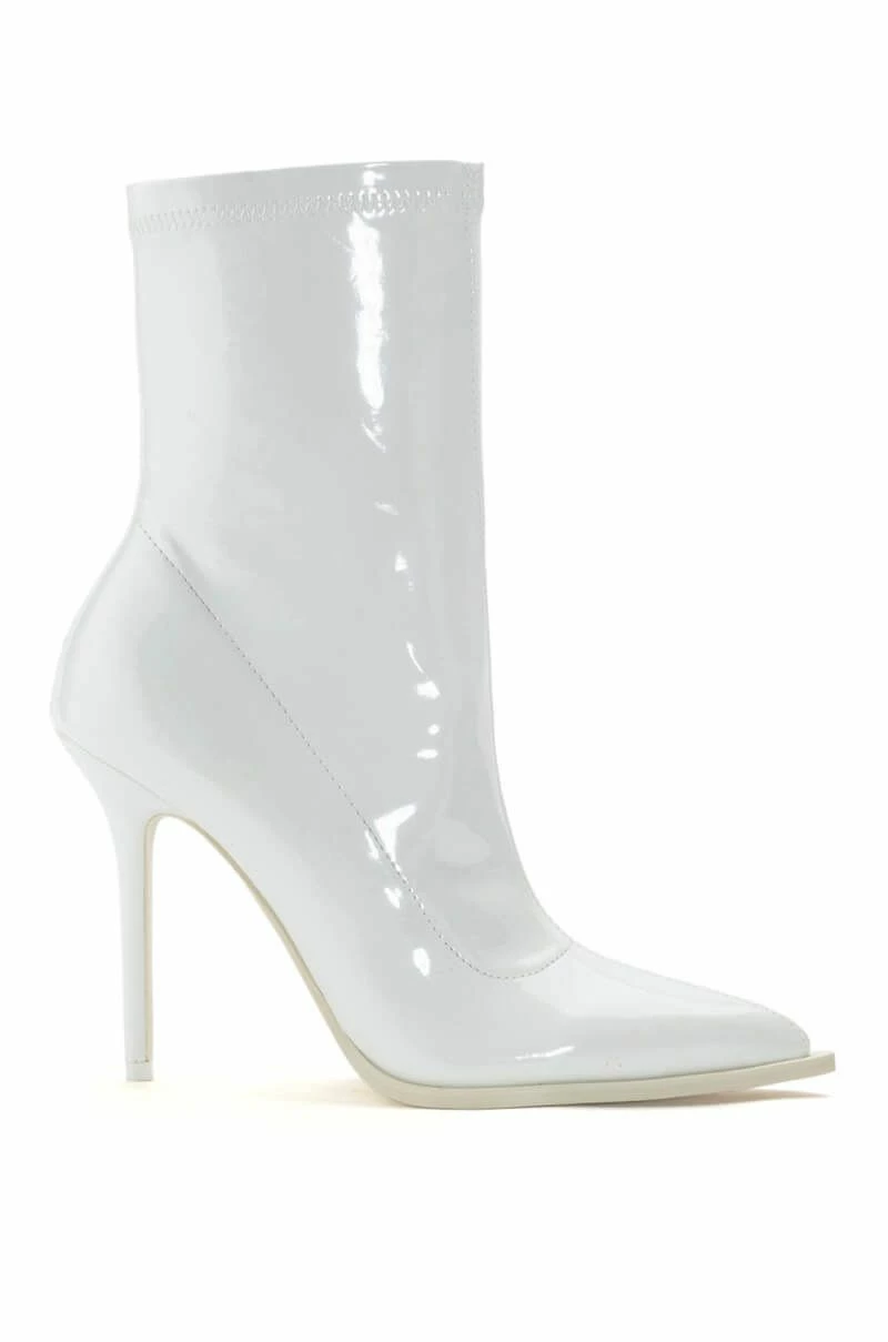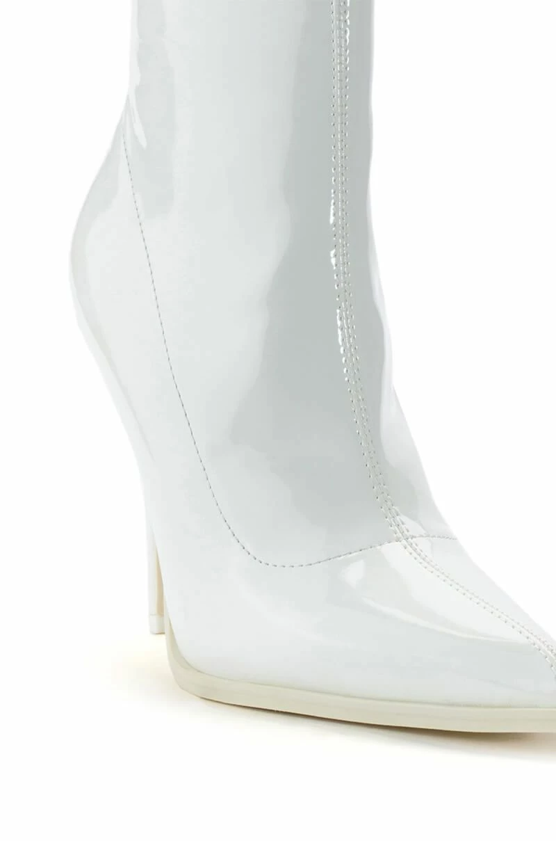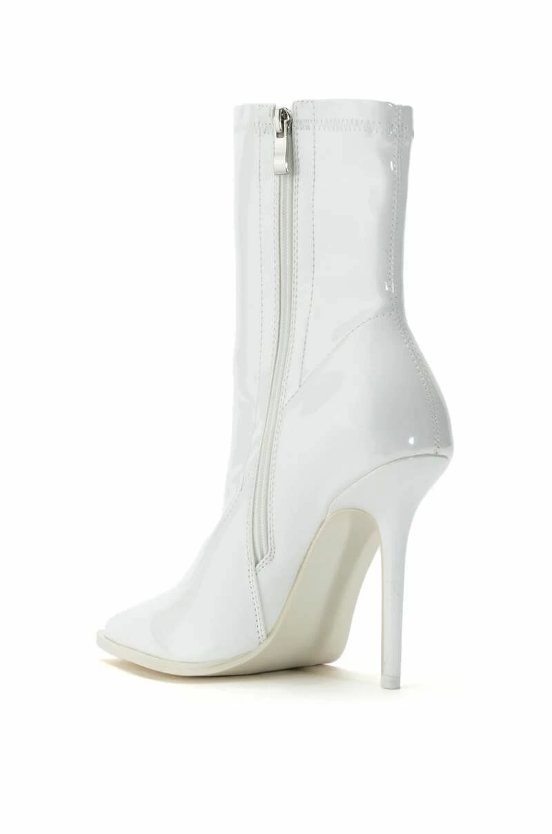 The AZALEA WANG Isabella Patent Stretch Bootie In White is a chic must-have ankle boot featuring an ultra-shiny vegan patent leather upper, mid-calf height, an inner PVC pump, a pointed toe silhouette, a stiletto heel, and an inner ankle zipper closure.