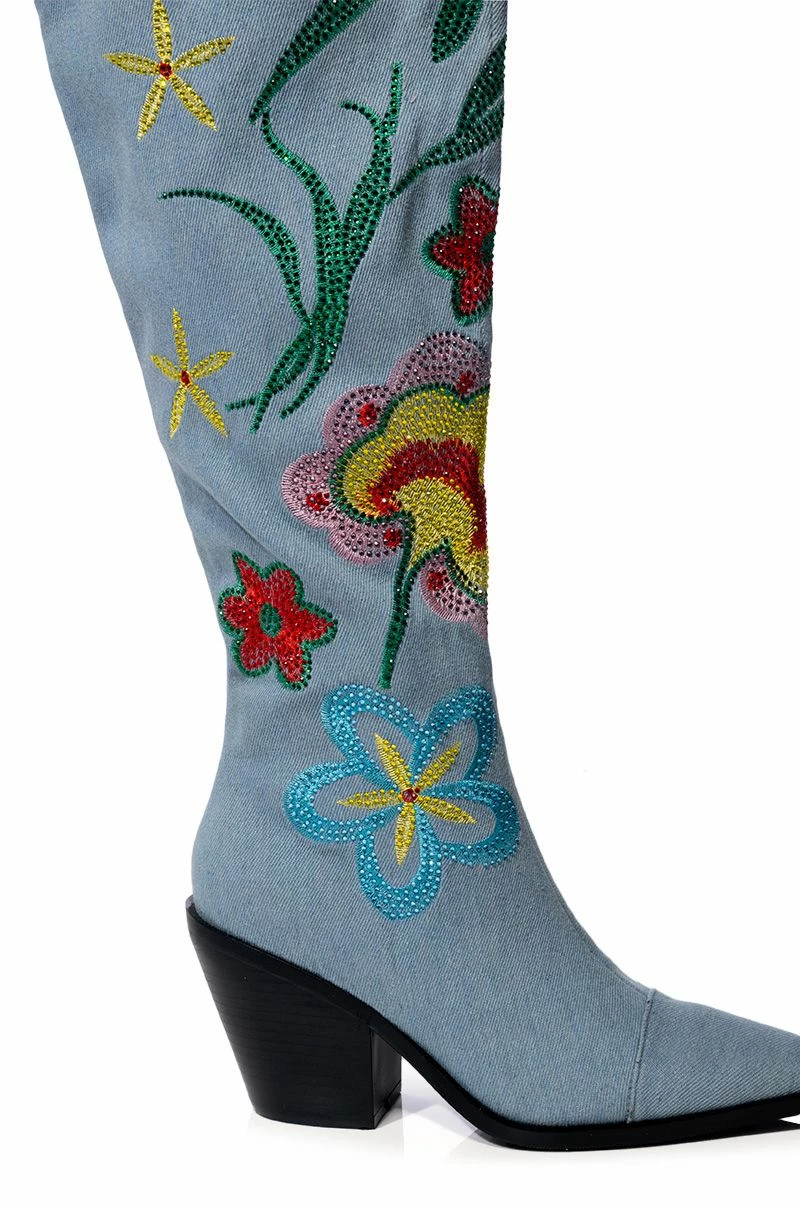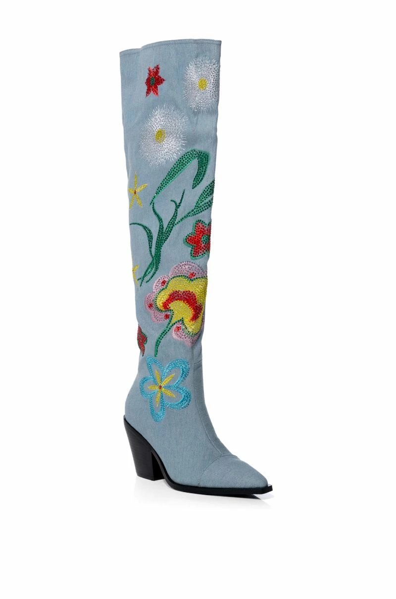 The AZALEA WANG Izara Over The Knee Embellished Boot In Denim is made from a washed denim fabrication and features a pointed toe silhouette, an over the knee-height shaft, a chunky heel, and an inner ankle zipper closure. Complete with colorful vintage floral stitching and rhinestone embellishments.