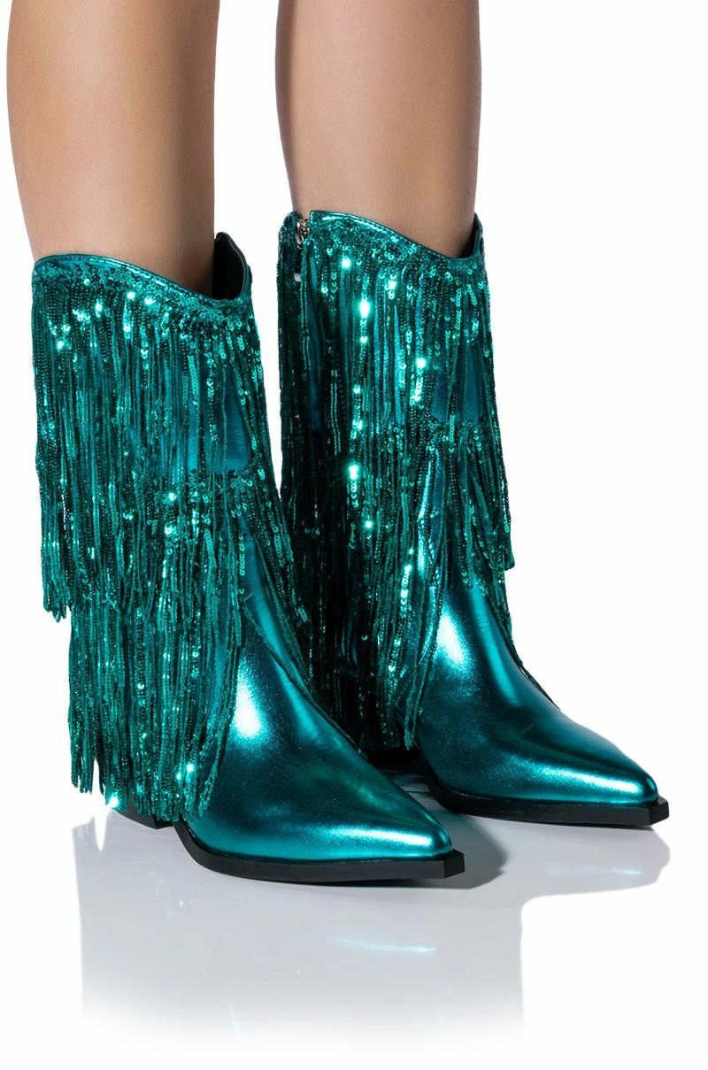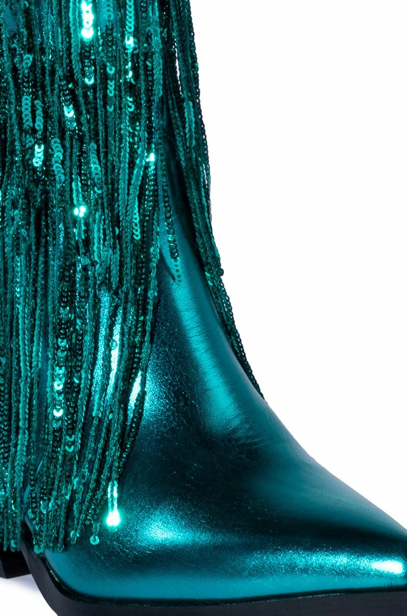 The AZALEA WANG Joyful Ring Western Bootie In Blue features a glossy, metallic patent vegan leather upper, a Western-inspired shaft with mid calf height, and iridescent sequined fringe allover. Complete with a pointed square toe silhouette, an inner zipper closure, and a short, chunky heel.