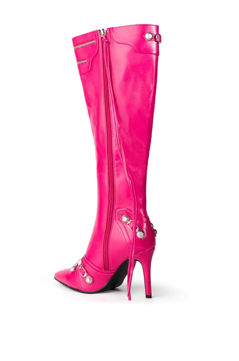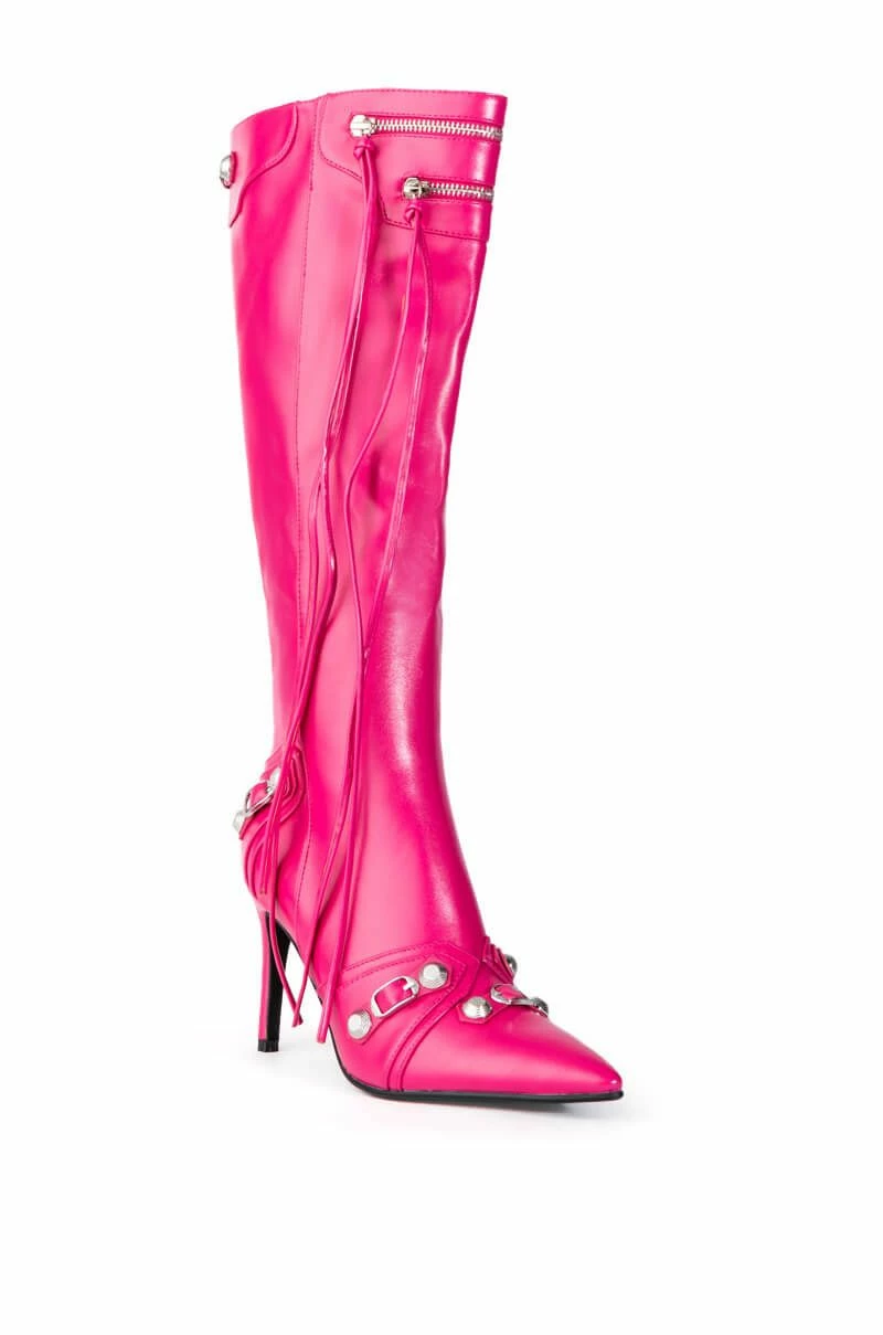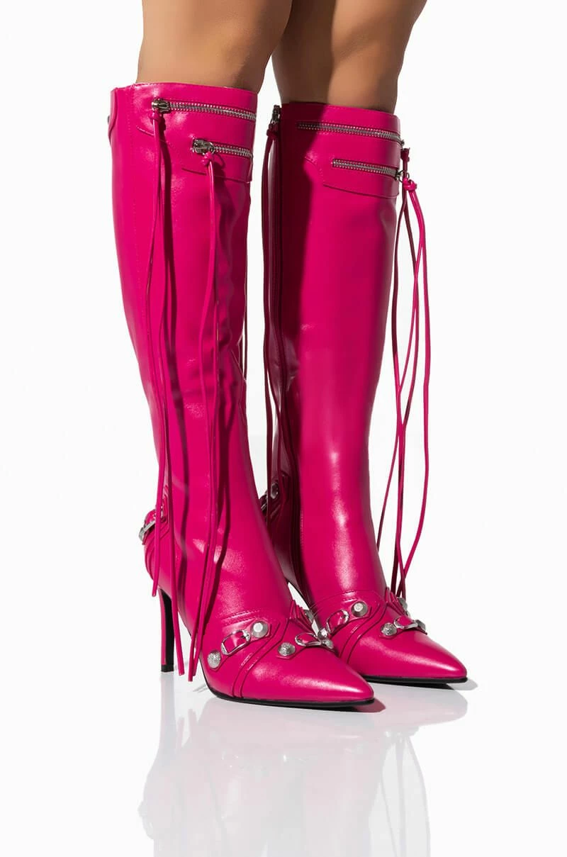 A boot is something that can actually be so personal. The AZALEA WANG Just For You Stiletto Bootie in Fuchsia is an ultra-sexy vegan leather boot featuring a pointed toe silhouette, a faux suede base, a slim stiletto heel, and a knee-height shaft. Complete with faux buckle accents throughout, silver metallic hardware, top zip detailing, tassel trim, and a classic inner ankle zipper closure. Style with a sleek mini skirt, an oversized band tee, and a faux leather jacket for a complete look.