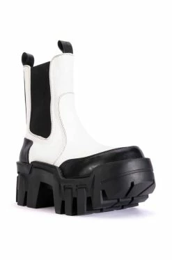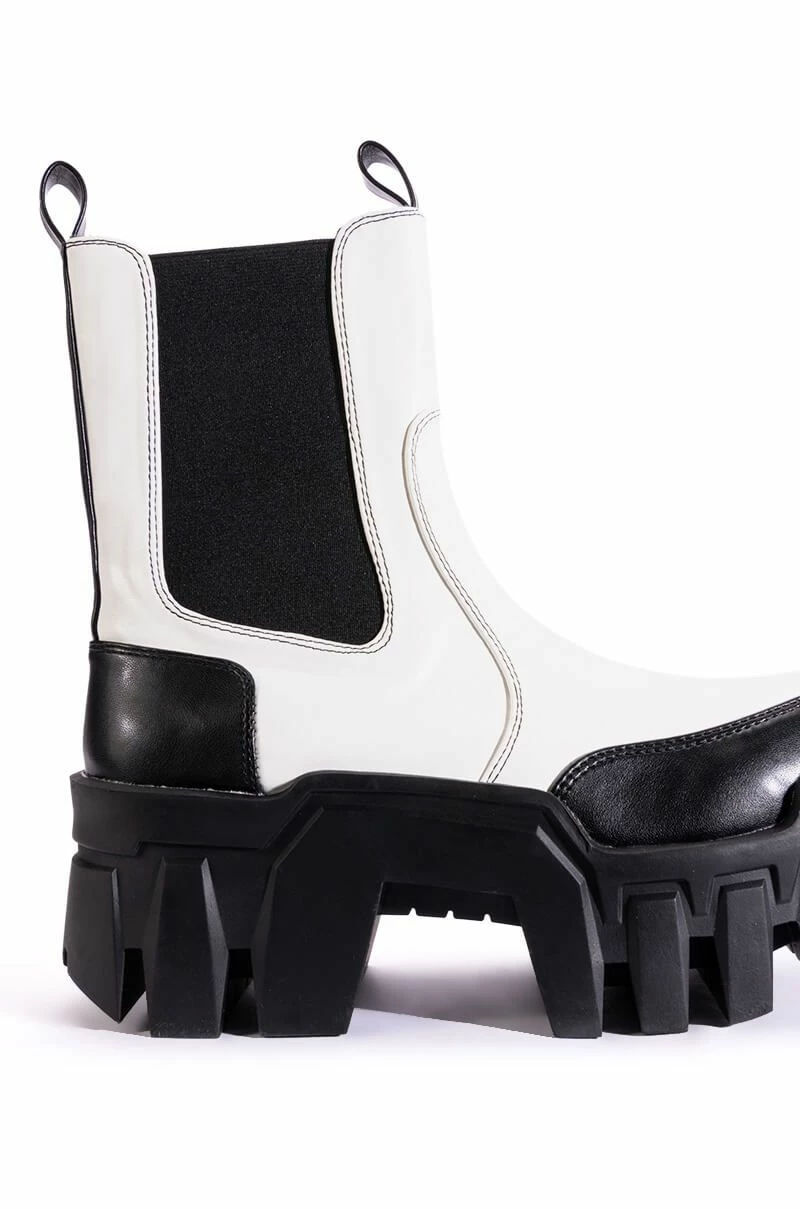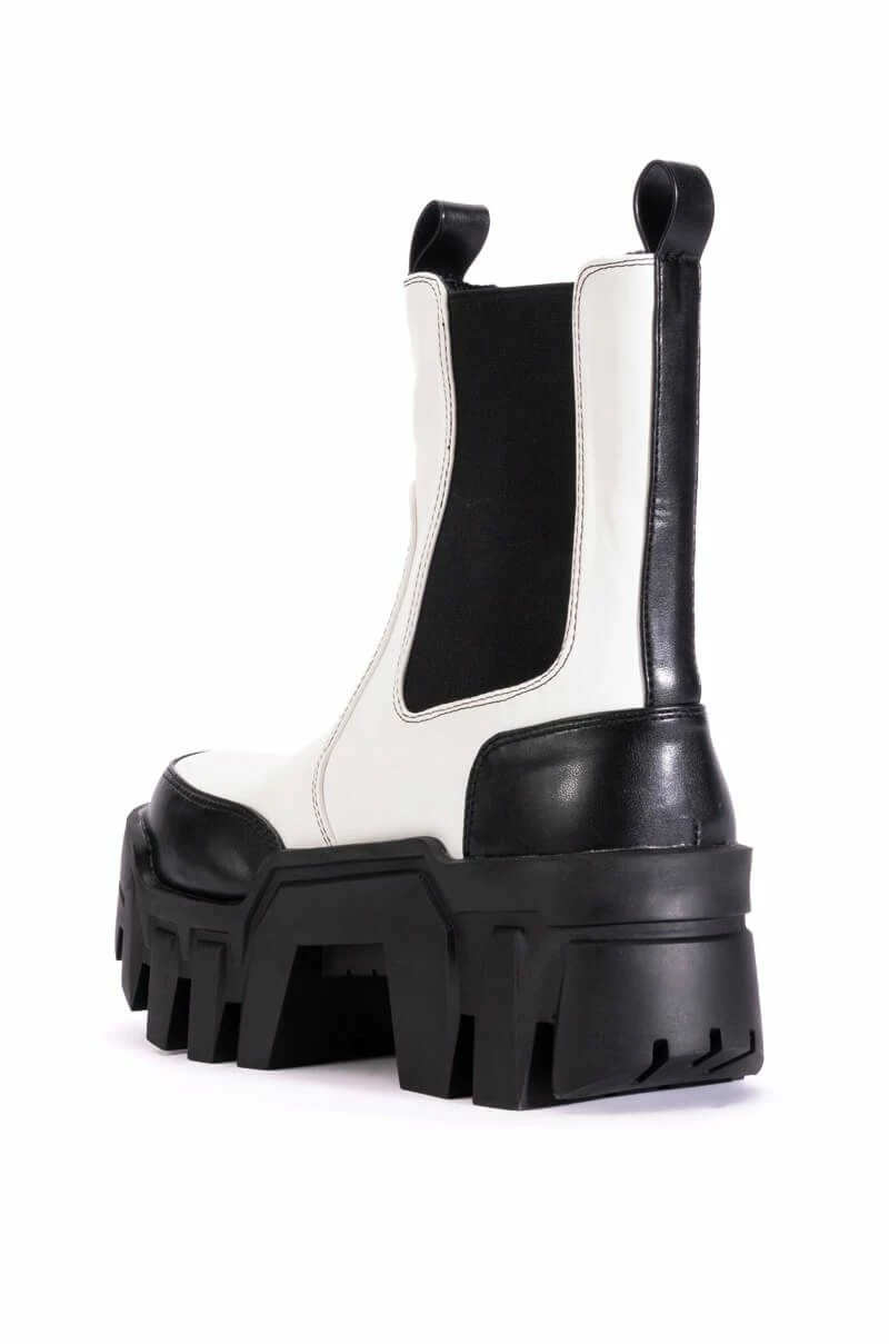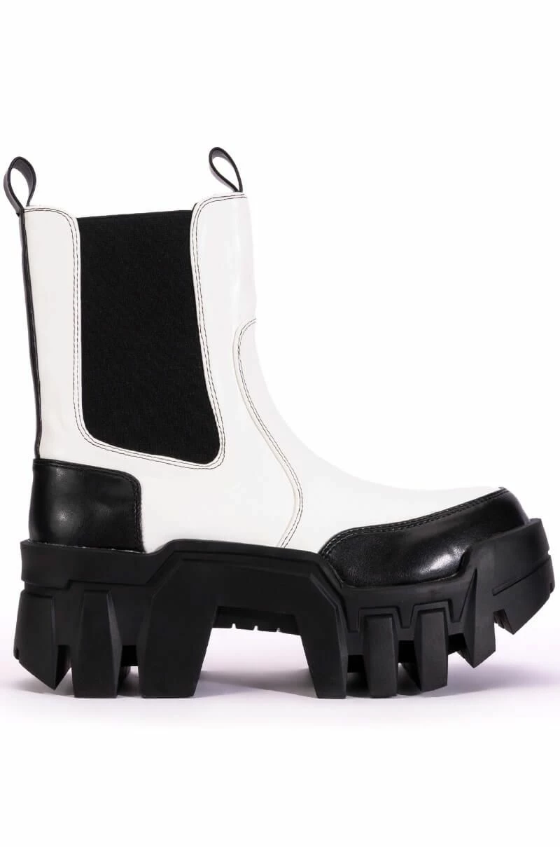 The AZALEA WANG Keliana Chunky Boot In White features a smooth faux leather upper, a mid calf shaft height, elastic side paneling, a pull on fit, dual pull tab accents, and a chunky split sole rubber platform base. Complete with a ridged lug sole, perfect for the winter’s snowy streets. Pairs perfectly with leather look leggings and a chic duster cardigan.