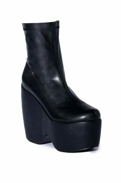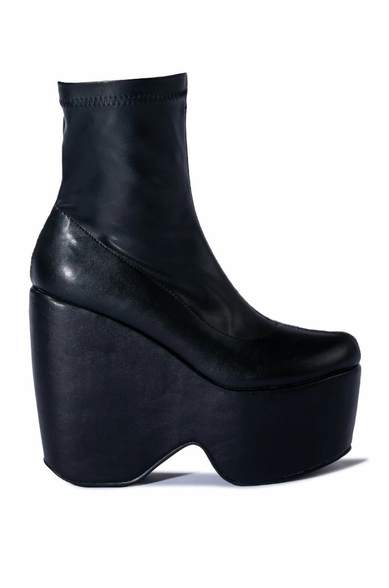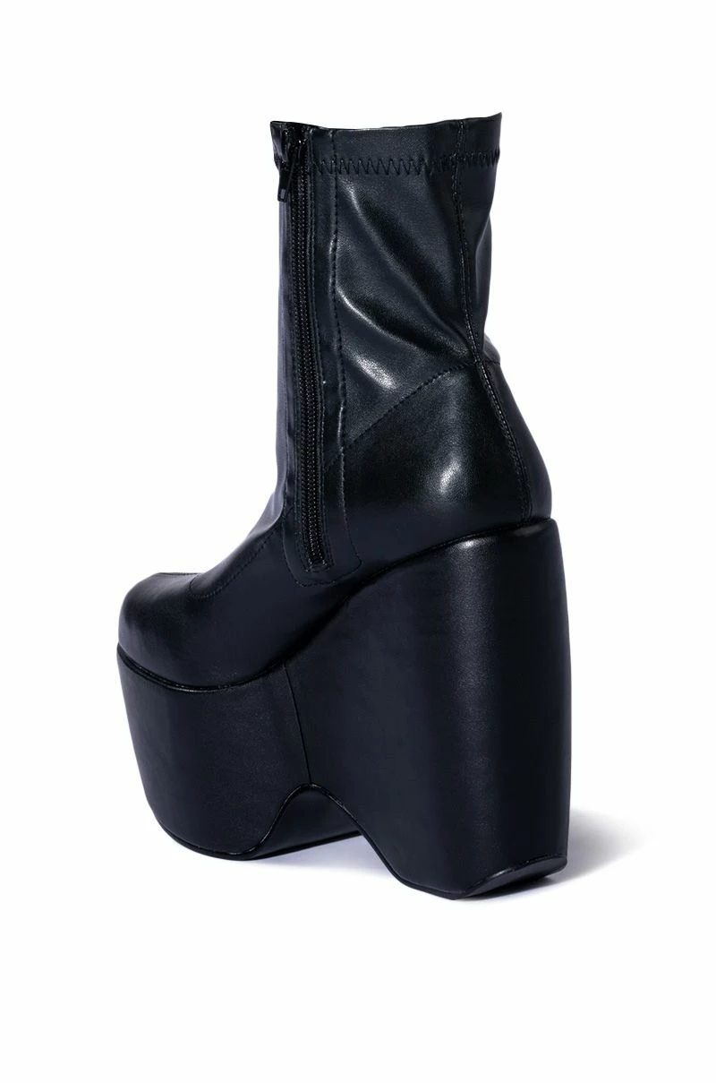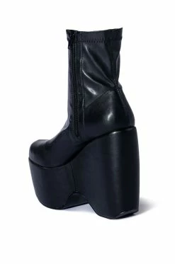 The AZALEA WANG Loxley Wedge Boot in Black features a smooth vegan leather upper, an almond toe silhouette, an ankle height shaft, a chunky platform wedge heel, and an inner ankle zipper closure.