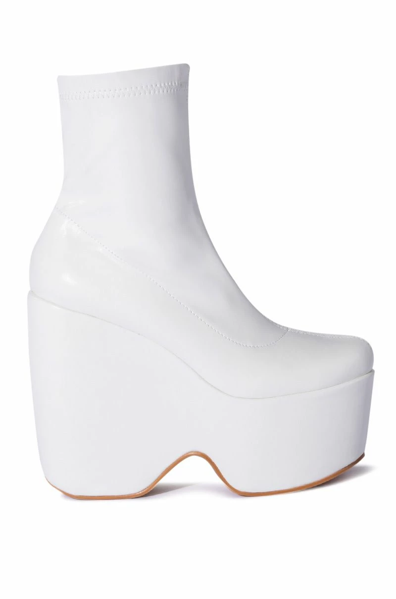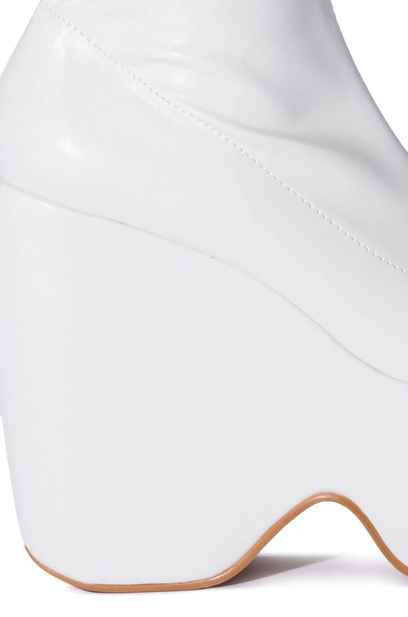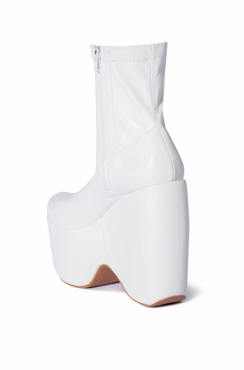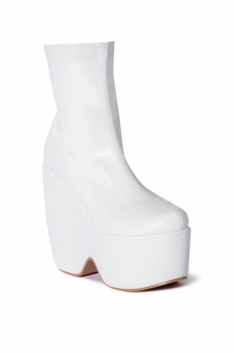 The AZALEA WANG Loxley Wedge Boot in White features a smooth vegan leather upper, an almond toe silhouette, an ankle height shaft, a chunky platform wedge heel, and an inner ankle zipper closure.