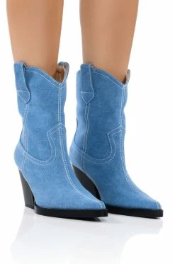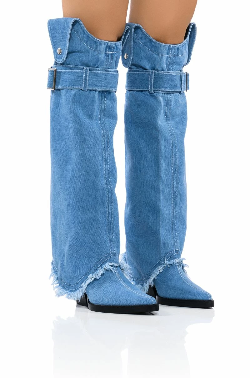 The AZALEA WANG Matty 2 In 1 Boot In Denim is a Western-style boot made from a denim upper featuring a below the knee height design, a removable shaft with a buckled belt, snap button detailing, and a distressed hem, a pointed toe silhouette, a chunky heel, and a pull-on fit. This ingenious 2-In-1 Boot converts into a mini bootie when you pull off the removable shaft! Perfect for an unforgettable night on-the-go.
