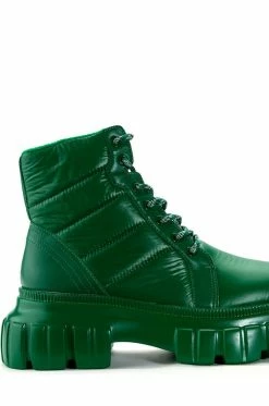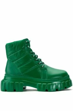The AZALEA WANG Mercedes Puffer Flatform Boot In Green is made from a slick puffer upper and features an ankle-height shaft, a round toe silhouette, quilted detailing, soft fuzzy lining, a lace up vamp, and a ridged rubber flatform sole.