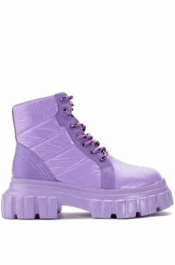 The AZALEA WANG Mercedes Puffer Flatform Boot In Purple is made from a slick puffer upper and features an ankle-height shaft, a round toe silhouette, quilted detailing, soft fuzzy lining, a lace up vamp, and a ridged rubber flatform sole.