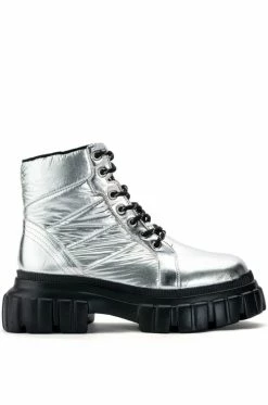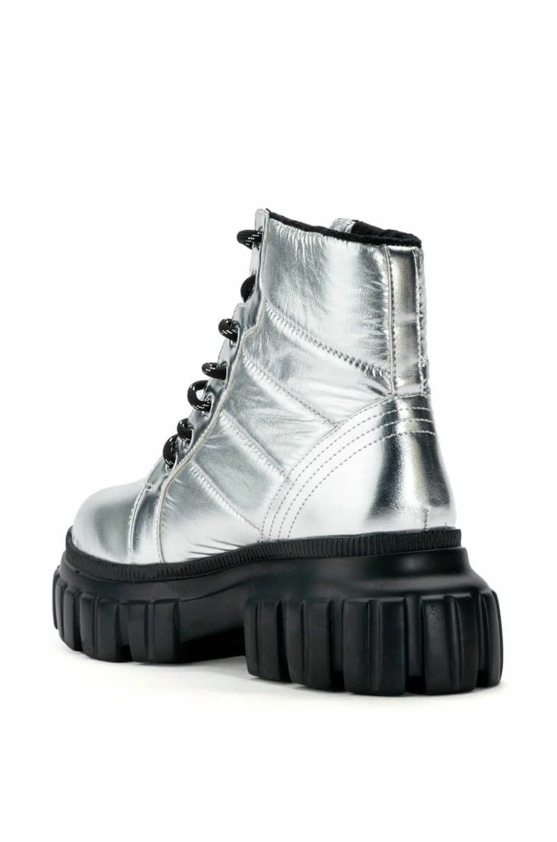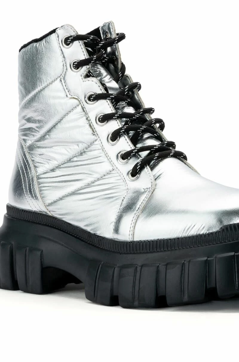 The AZALEA WANG Mercedes Puffer Flatform Boot In Silver is made from a slick puffer upper and features an ankle-height shaft, a round toe silhouette, quilted detailing, soft fuzzy lining, a lace up vamp, and a ridged rubber flatform sole.
