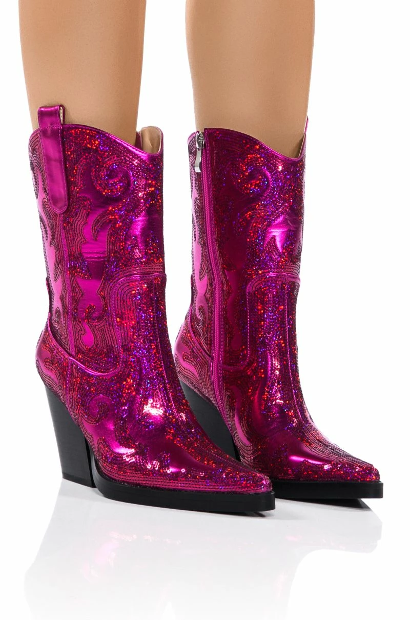The AZALEA WANG Merril Sequin Western Bootie In Fuchsia is made from a vegan leather upper and features Western-inspired iridescent sequin detailing, a pointed toe silhouette, a mid-calf height shaft, a side pull tab, a chunky heel, and an inner ankle zipper closure.