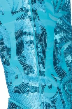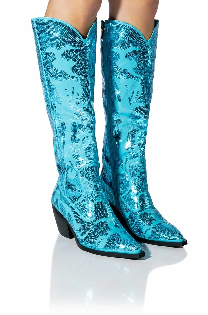 The AZALEA WANG My Sweetheart Sequin Embellished Boot In Blue features a vegan patent leather upper, a curved knee height shaft, a pointed toe silhouette, a chunky heel, and Western-inspired sequin embroidered detailing. Complete with a tonal inner ankle zipper.