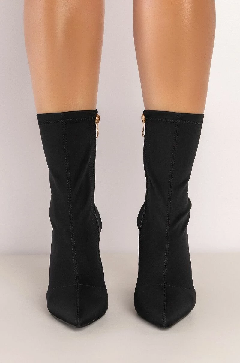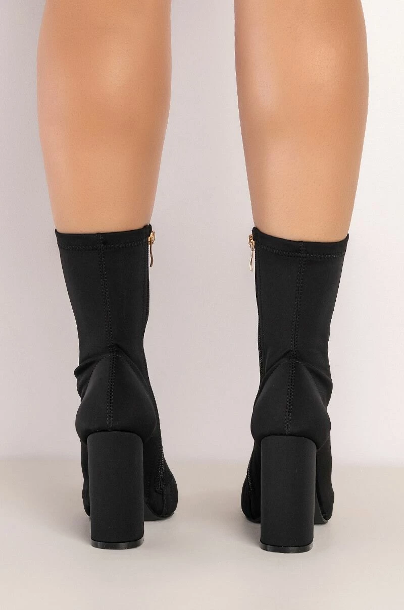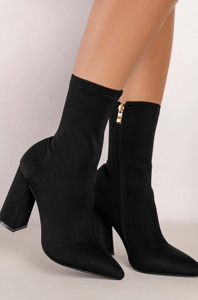 The AZALEA WANG Nothing Lasts Forever Chunky Bootie in Black is a sleek nylon sock boot featuring a mid calf silhouette, a zipper at the inner ankle, a pointed toe, and a chunky block heel. This classic boot is a staple style to add to your repertoire and looks chic with jeans and midi dresses alike.