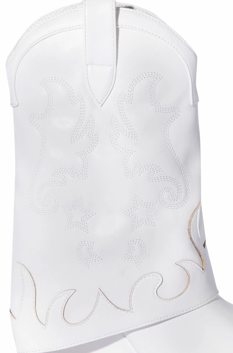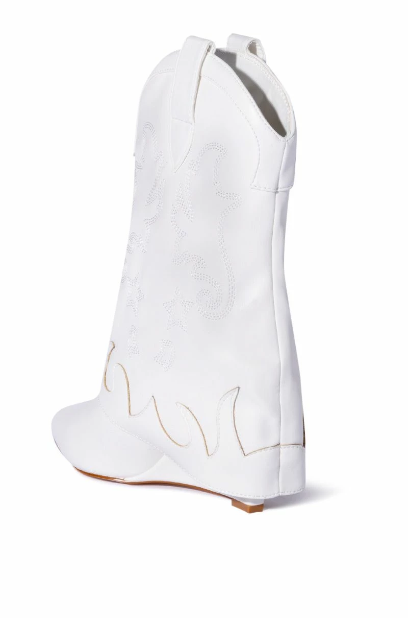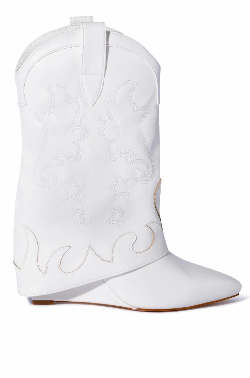 The AZALEA WANG Party In The USA Fold Over Western Boot in White features vegan leather upper, a mid calf shaft, tonal embroidered Western detailing, and a covered wedge heel. Complete with a pointed toe, a rounded Western-inspired shaft silhouette, and slip-on fit.