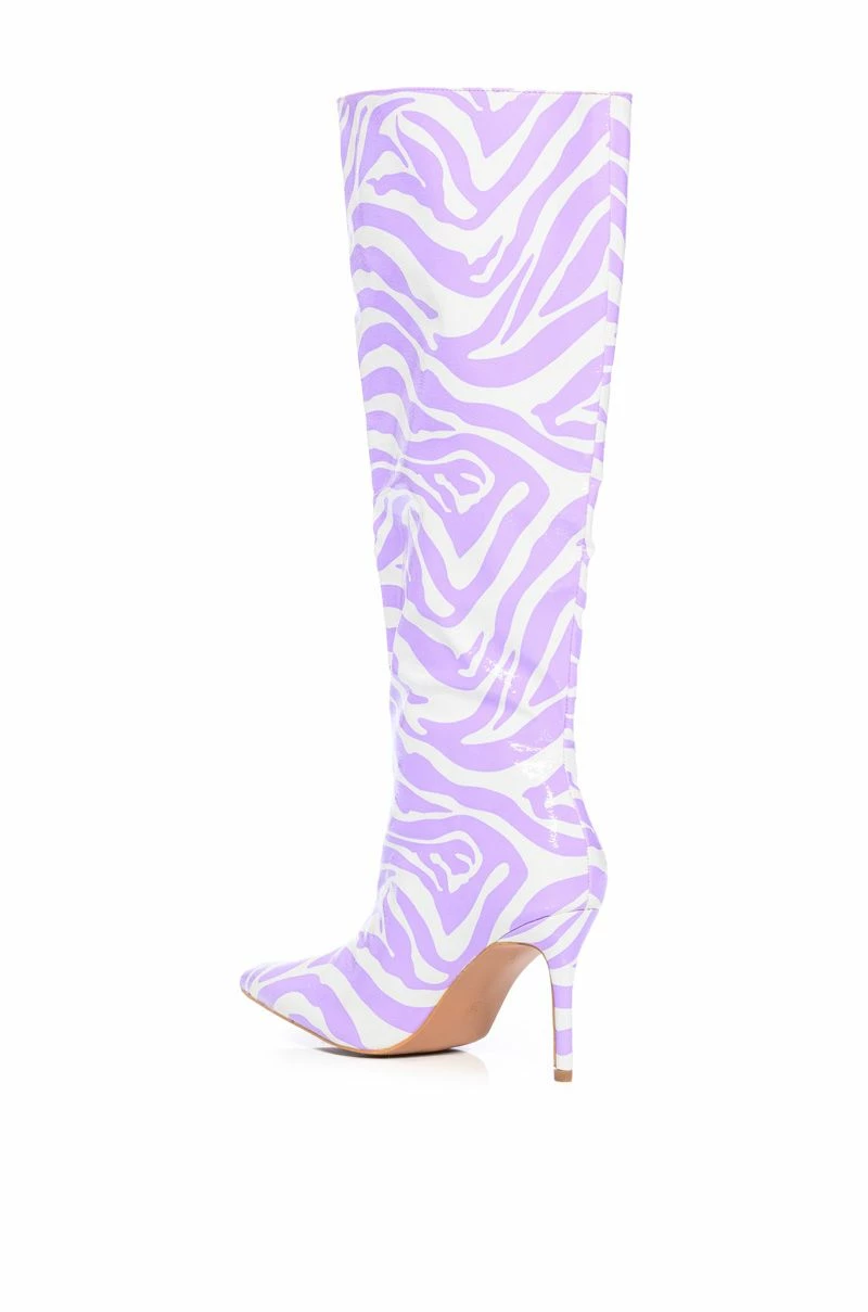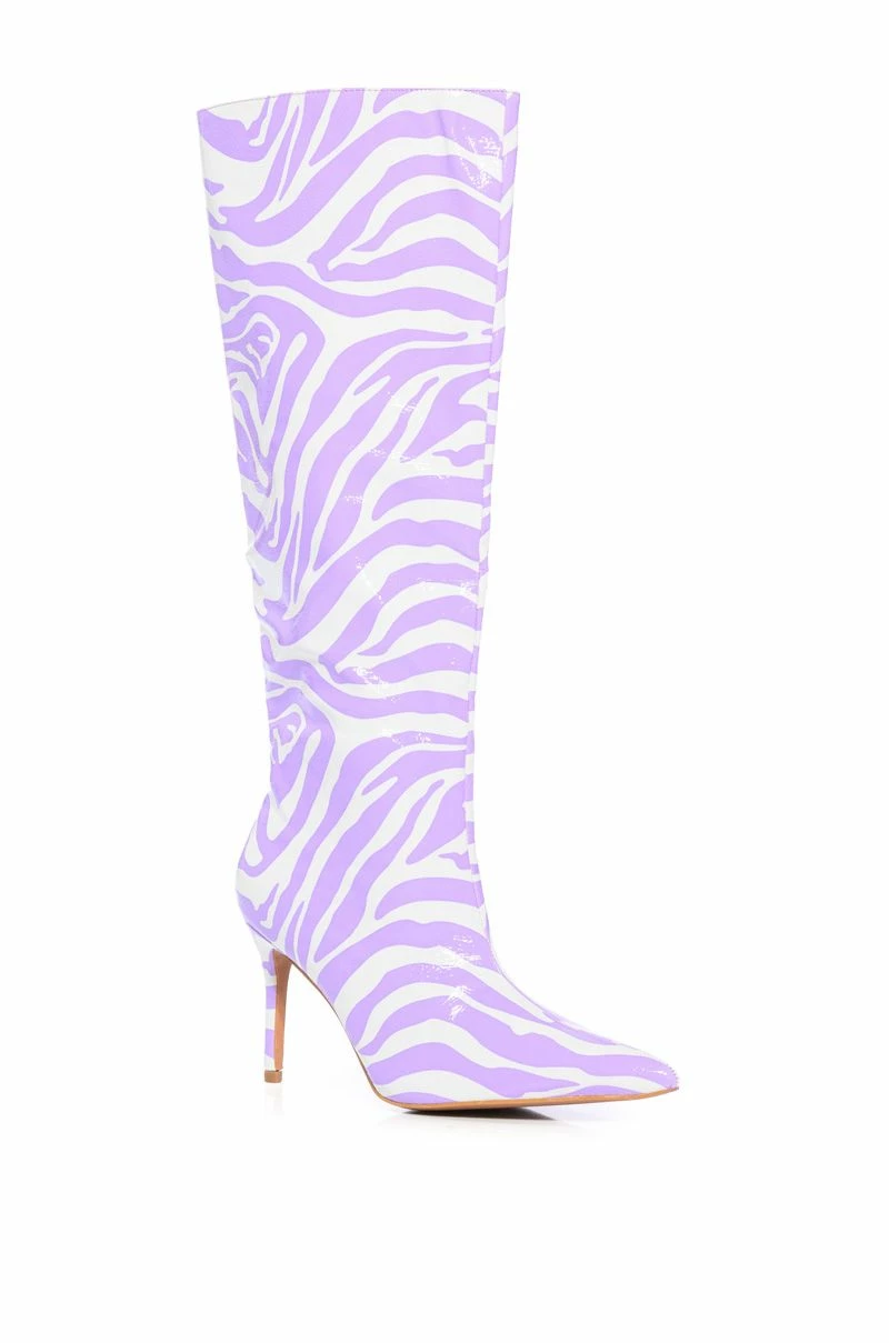 The AZALEA WANG Schroeter Stiletto Boot In Purple Is made from a PU vegan leather fabrication and features a zebra print design, pointed toe silhouette, a knee-high shaft, and a slim stiletto heel. Complete with a pull-on fit.