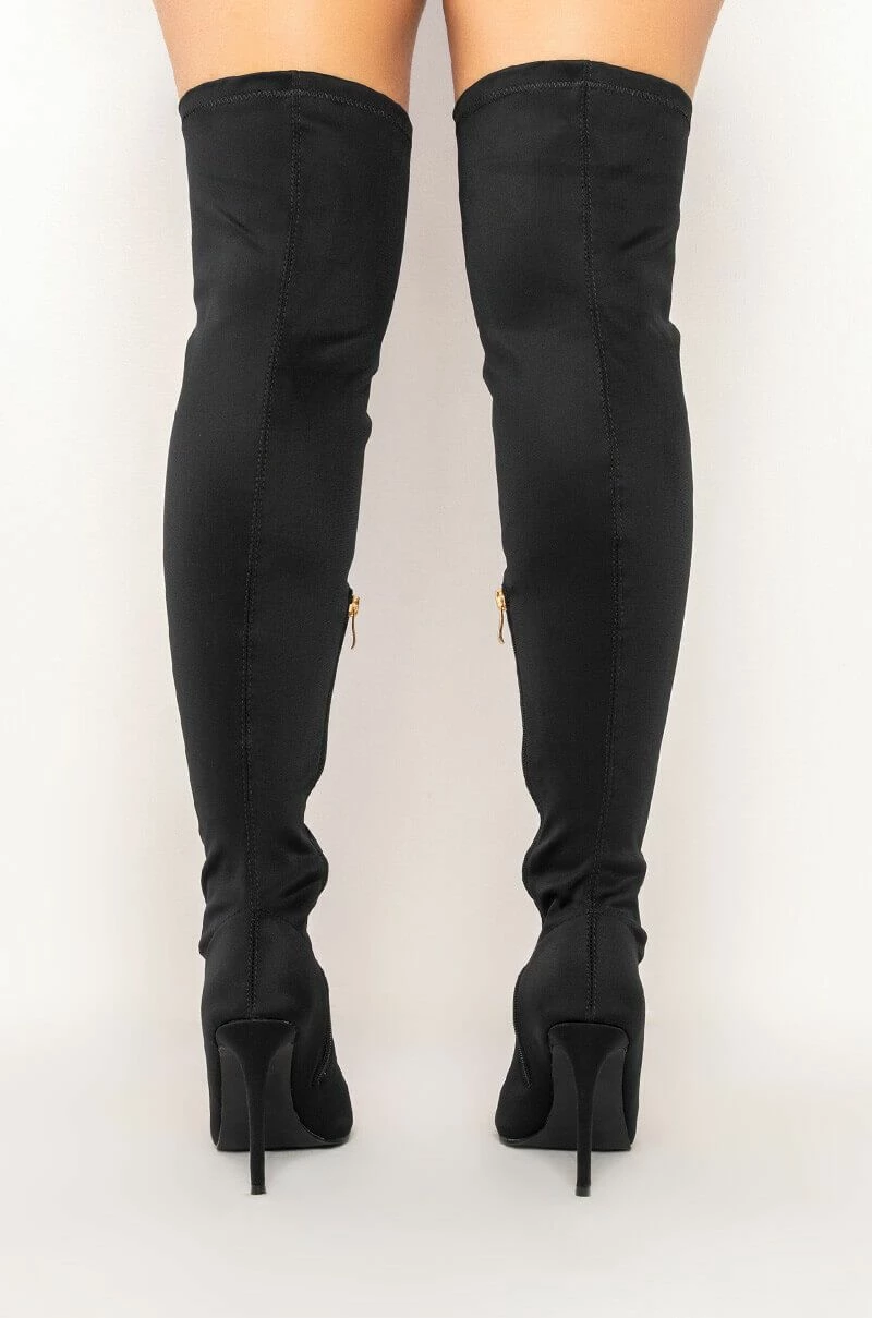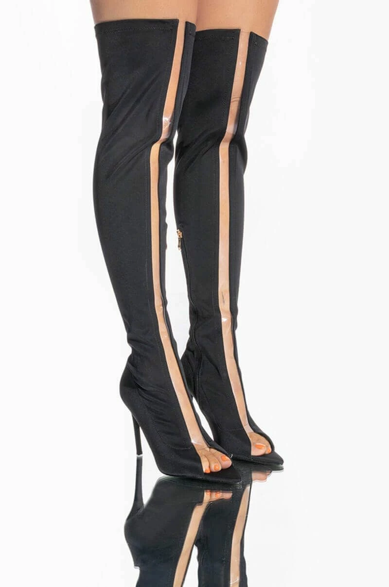 The AZALEA WANG Sheer Luck Stiletto Boot In Black is a sexy knee-high boot made from a slick nylon upper featuring a peep toe design, an over-the-knee silhouette, a clear rectangular panel down the front, and an inner ankle zipper closure.